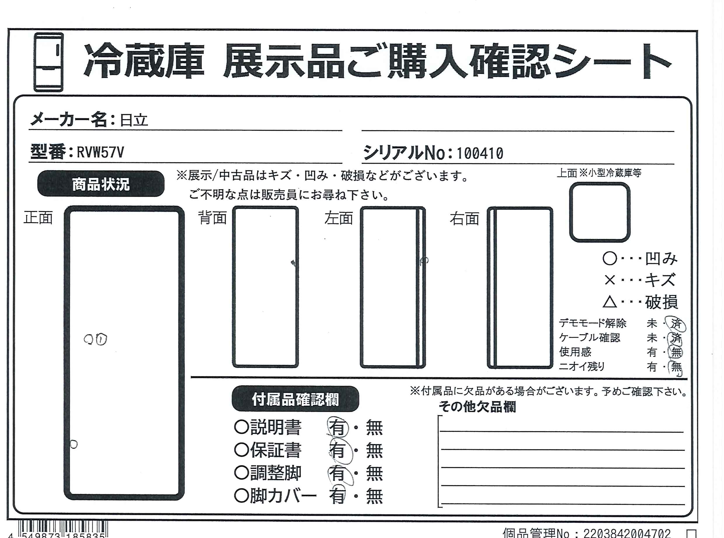 中古商品ランクについて 付属品・商品状態について 〔付属品〕取扱説明書、脚カバー、調節脚×2、小物ケース、卵スタンド、給水タンク、製氷スコップ、クッション×2、アルミトレイ