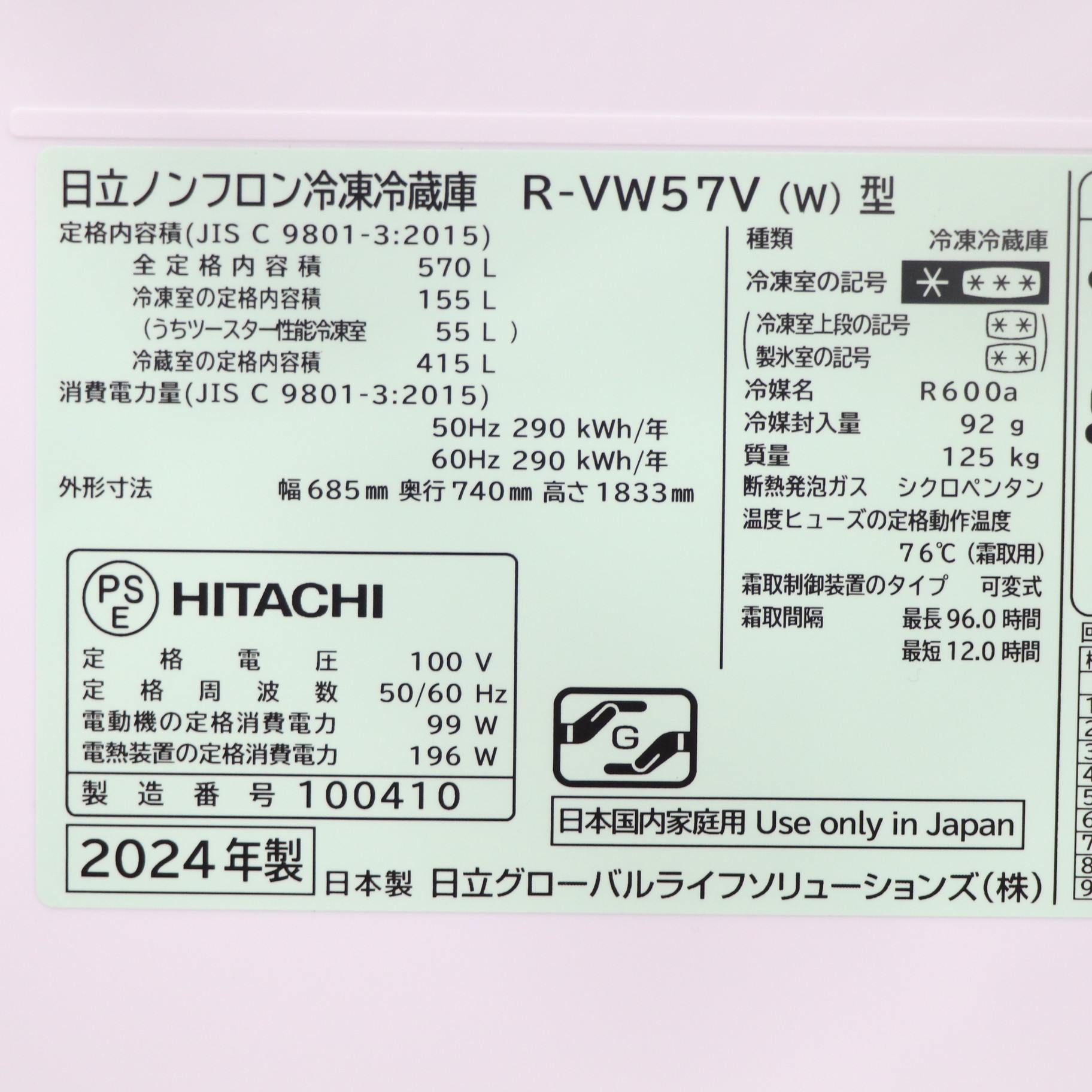 〔展示品〕 冷蔵庫 VWシリーズ ピュアホワイト R-VW57V-W [幅68.5cm /570L /6ドア /観音開きタイプ /2024年]