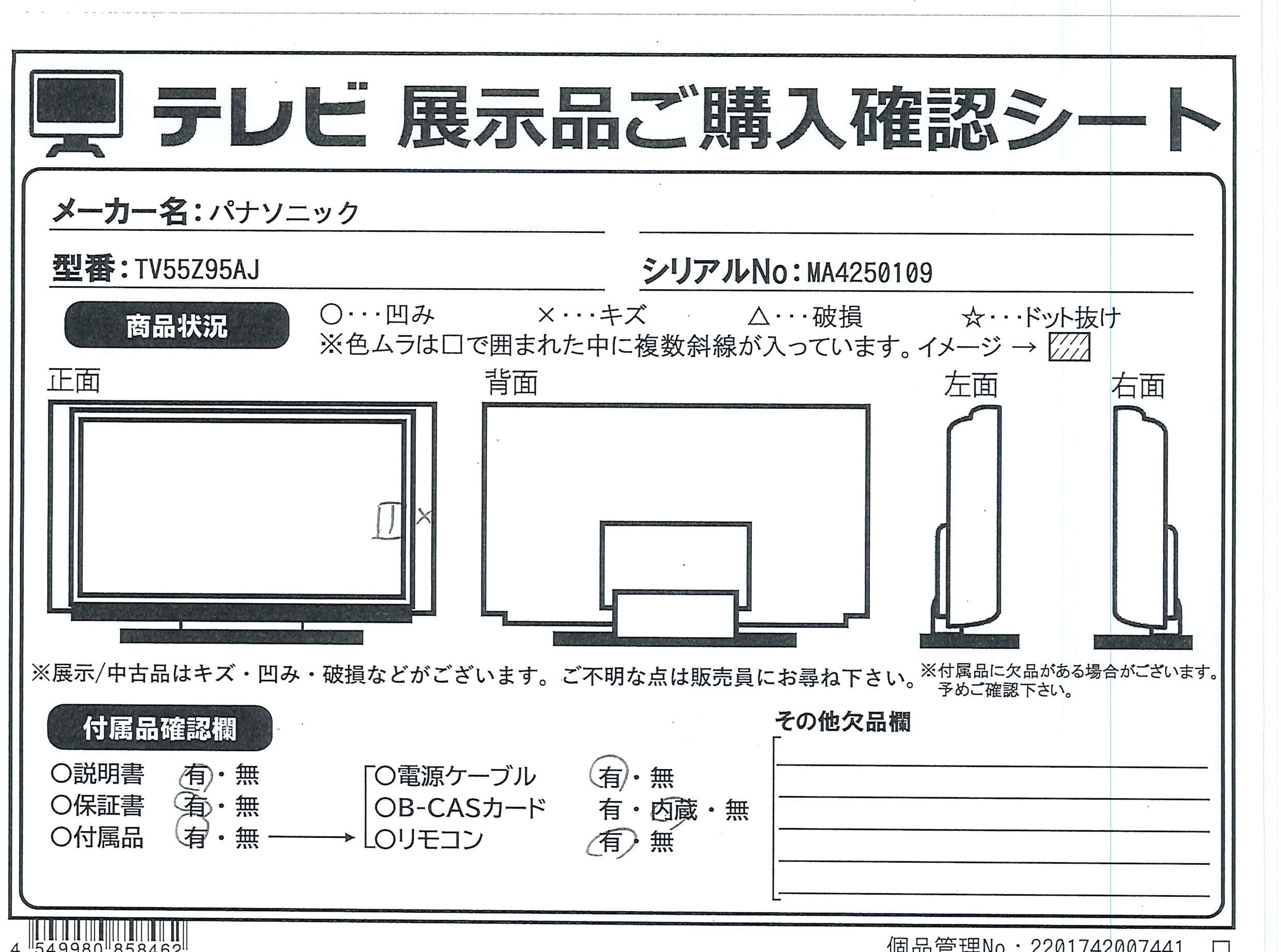 中古商品ランクについて 付属品・商品状態について 〔付属品〕取扱説明書、スタートガイド、リモコン、リモコン用単4形乾電池×2、ケーブルカバー、転倒防止スタンド、本体固定用ねじ×4、転倒・落下防止部品一式