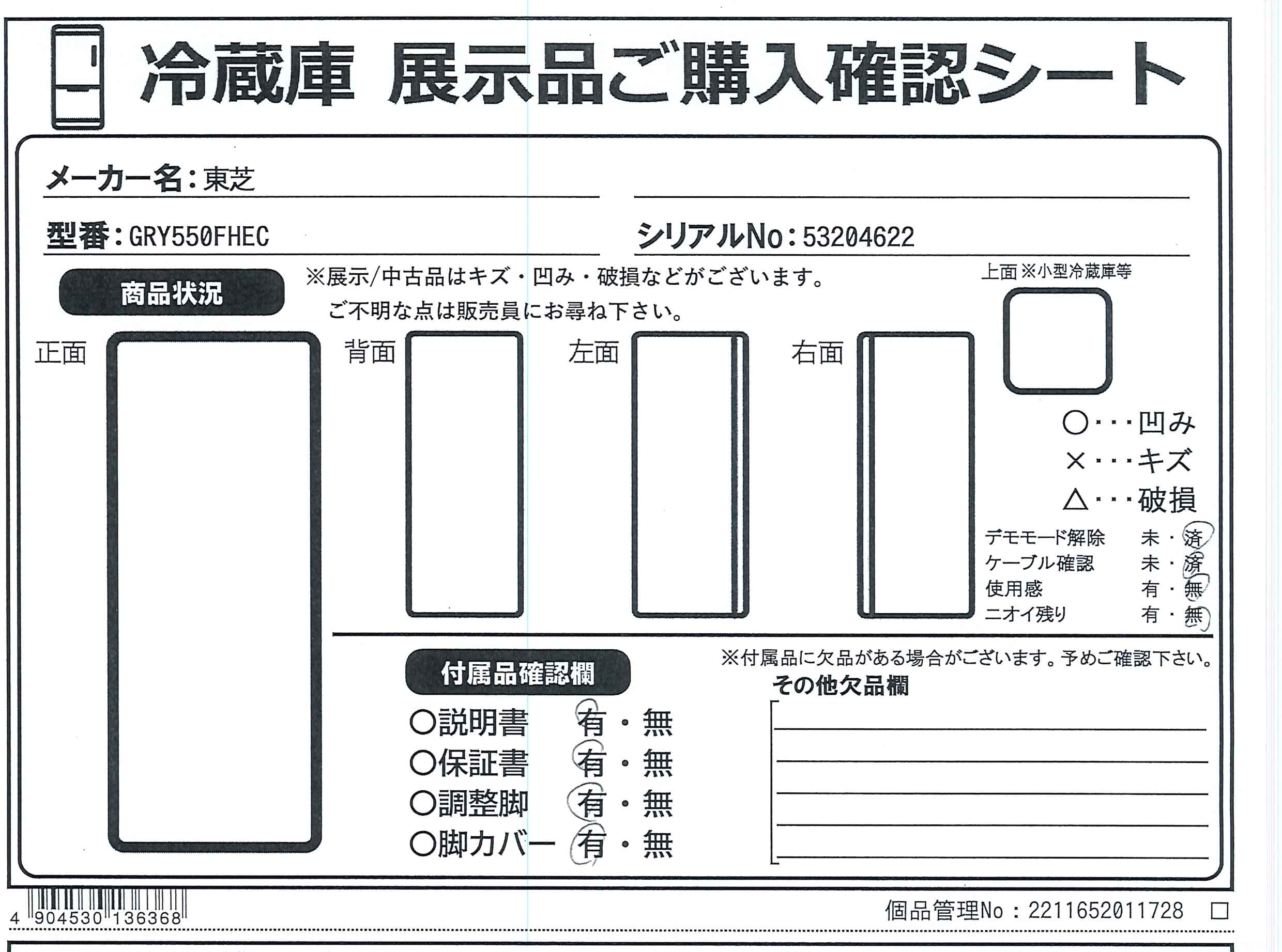 • 「冷蔵庫・標準搬入設置費」は、1,100円(税込)です。