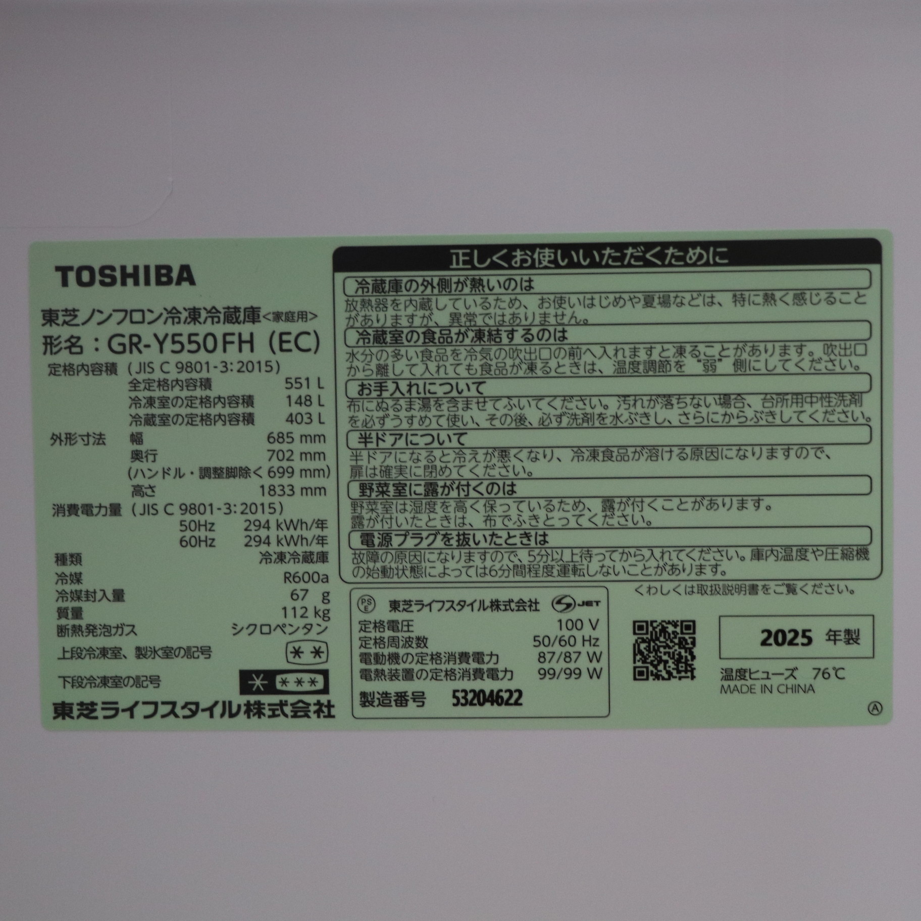 商品名 〔展示品〕 冷蔵庫 VEGETA(ベジータ)FHシリーズ サテンゴールド GR-Y550FH-EC [幅68.5cm /551L /6ドア /観音開きタイプ /2025年]