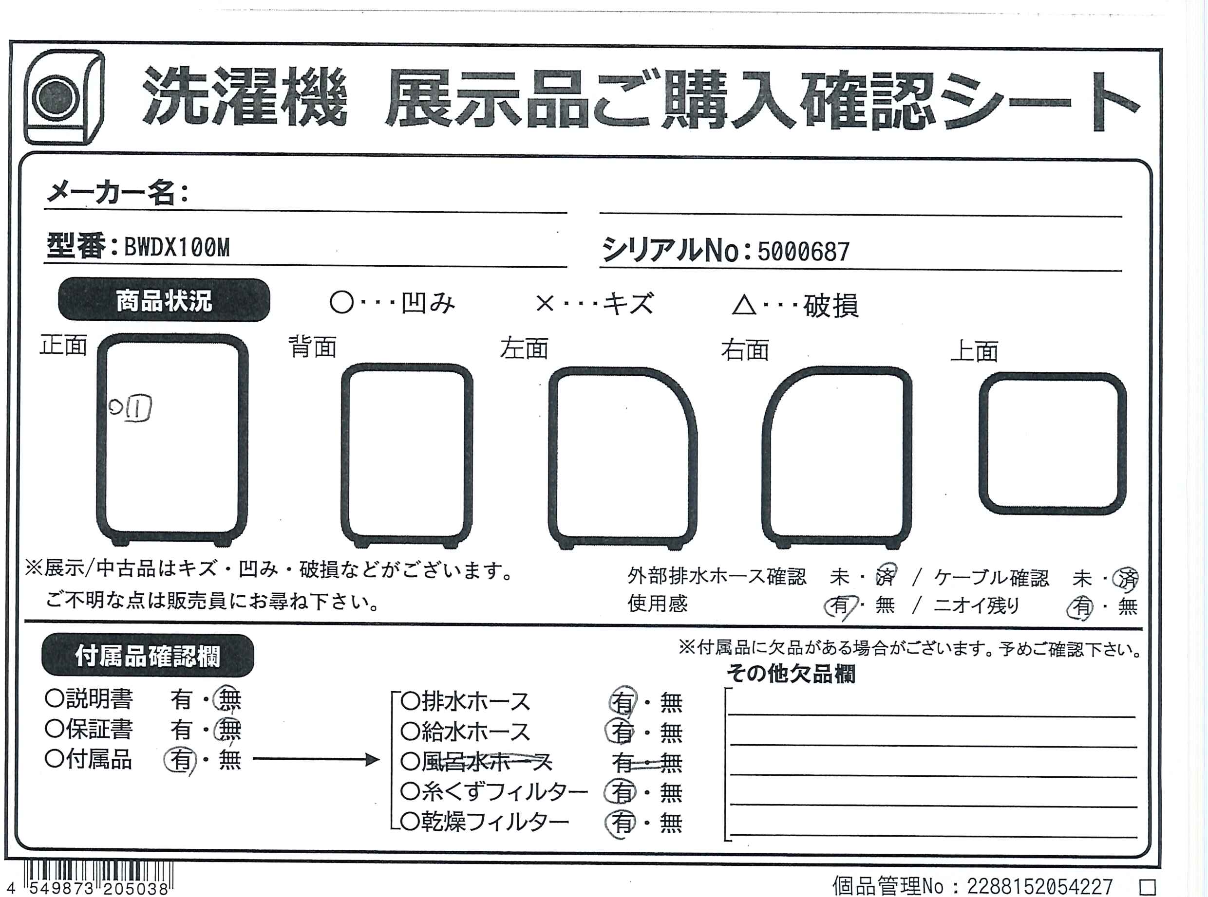中古商品ランクについて 付属品・商品状態について 〔付属品〕据付説明書、給水ホース、液体洗剤タンク、柔軟剤タンク、乾燥フィルター、糸くずフィルターX2