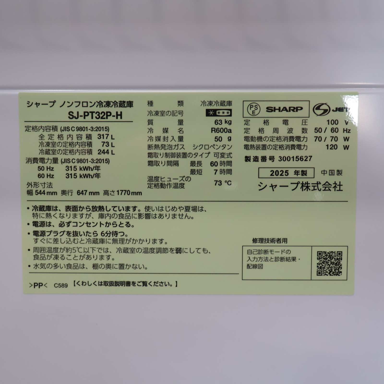 〔中古品〕 冷蔵庫 マットグレー SJ-PT32P-H [幅54.4cm /317L /3ドア /右開きタイプ /2024年]