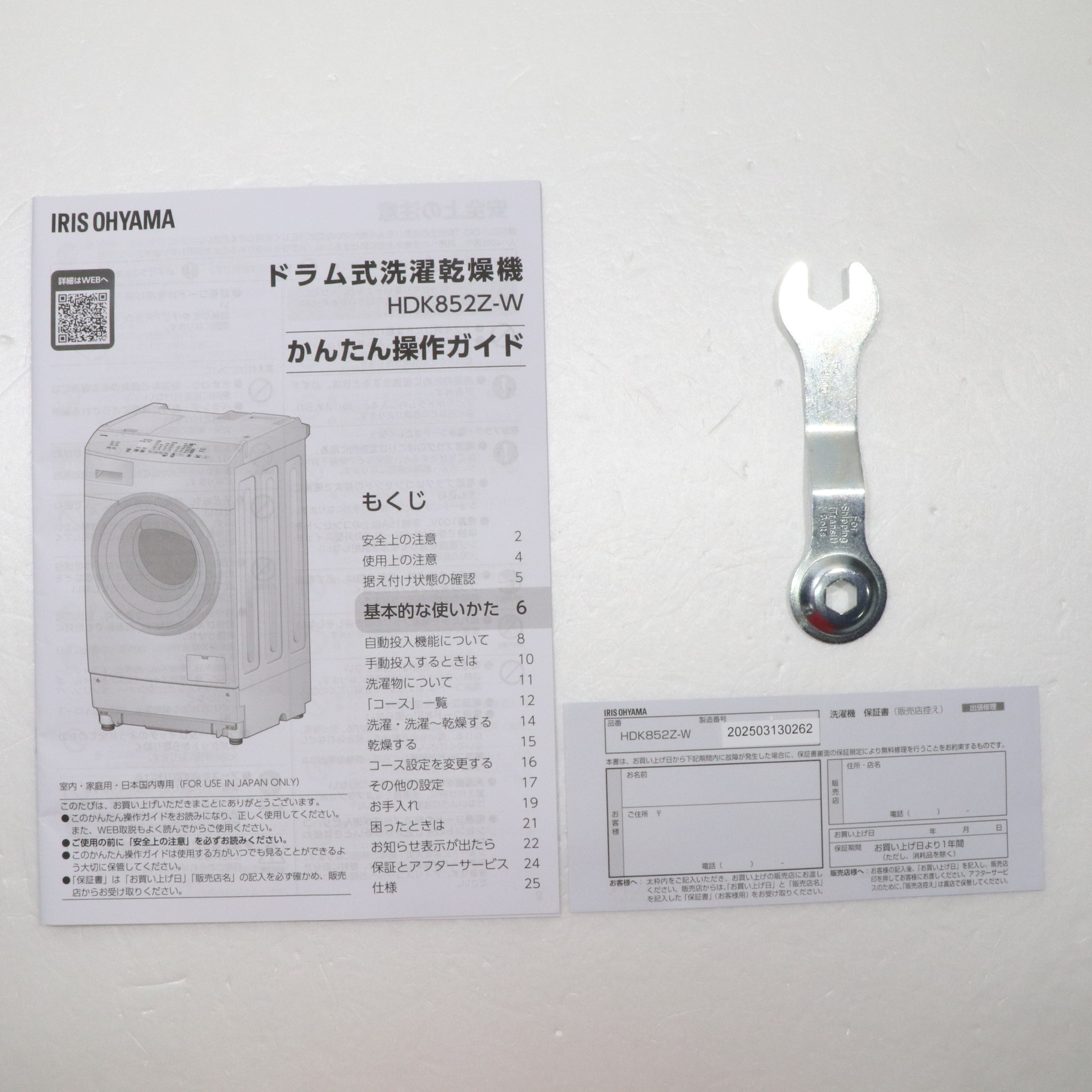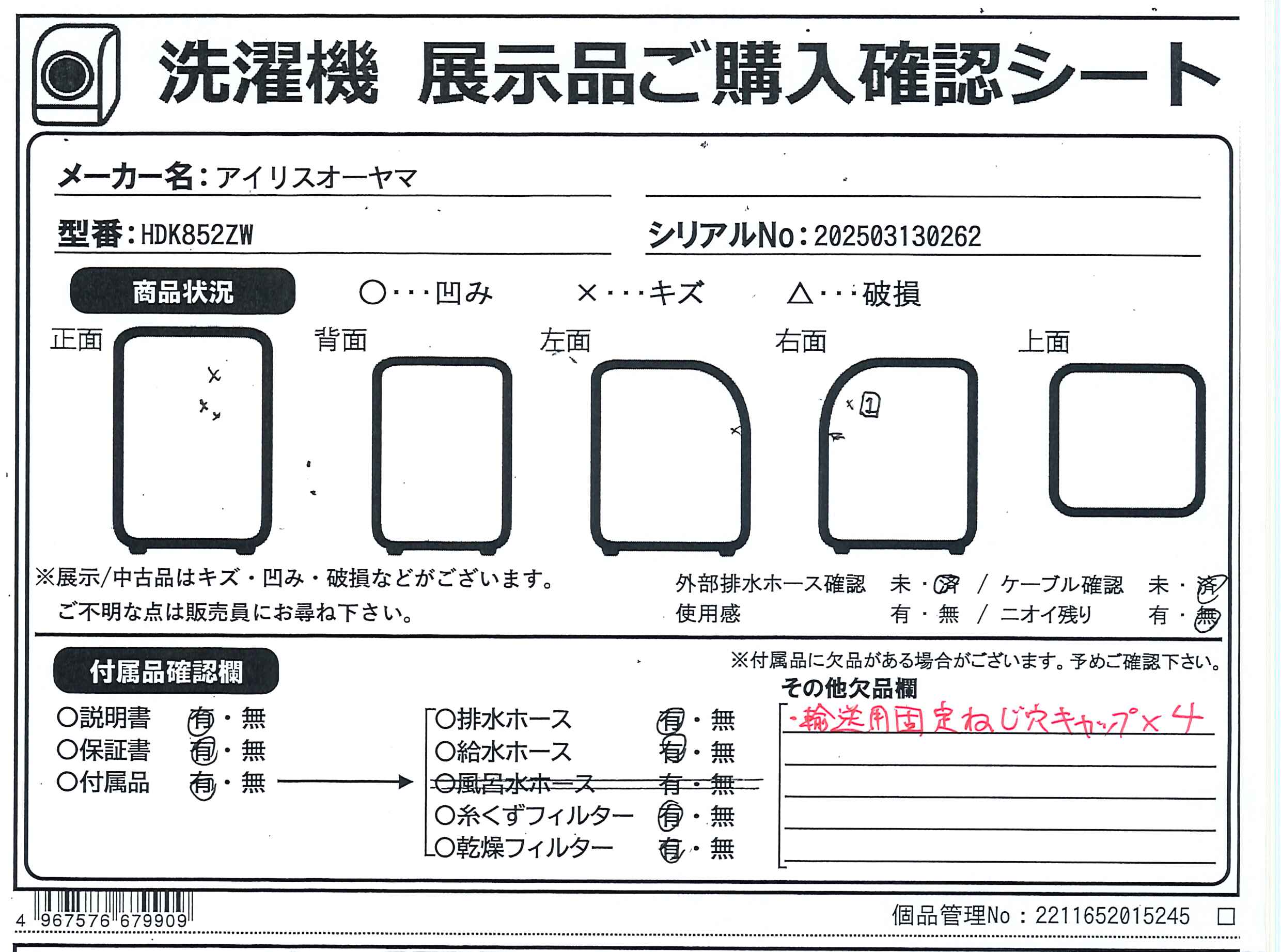 中古商品ランクについて 付属品・商品状態について 〔付属品〕説明書(かんたん操作ガイド)、据付説明書、給水ホース、排水ホース、ホースクリップ、輸送用固定ねじ4本、スパナ、接続口キャップ