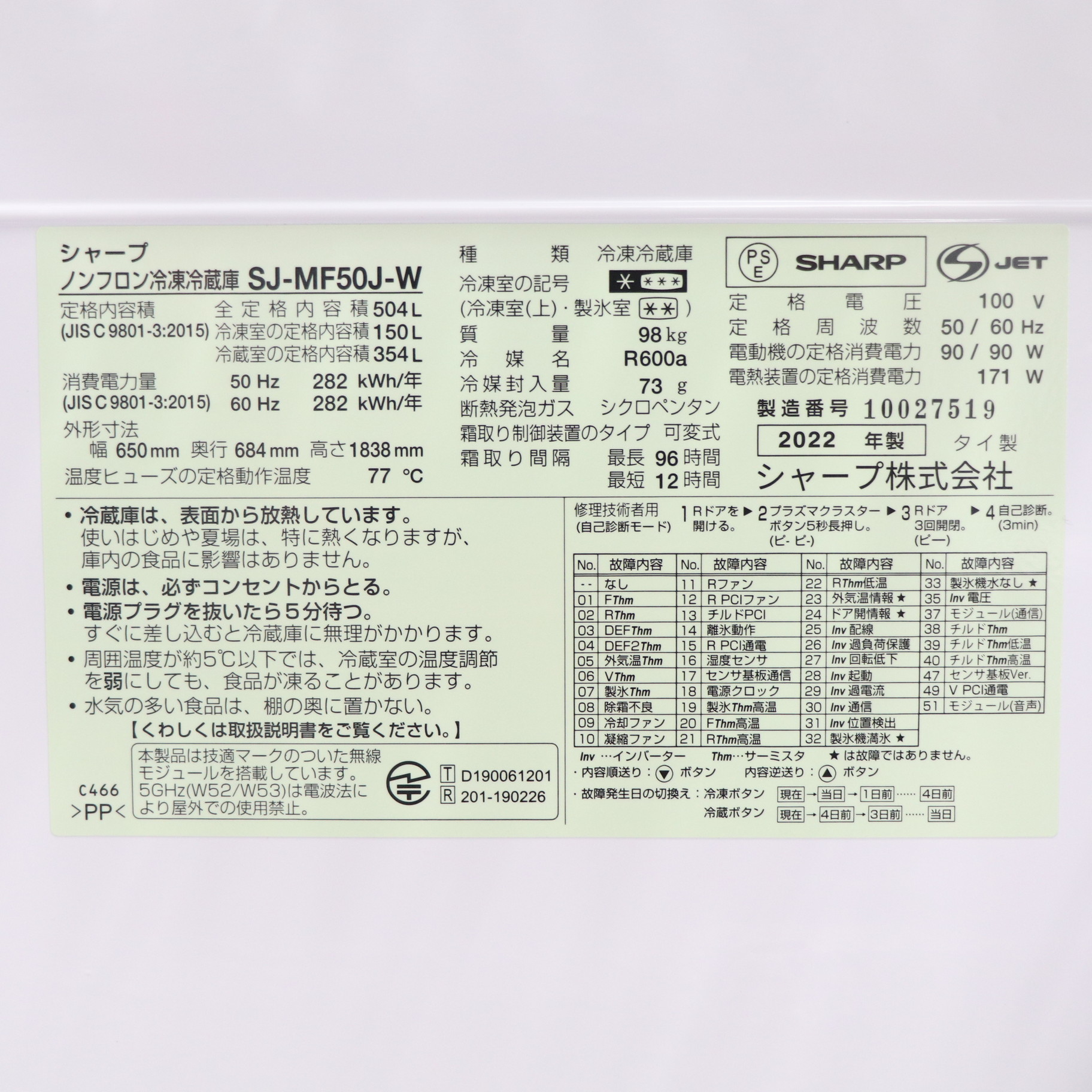 〔展示品〕 冷蔵庫 ラスティックホワイト SJ-MF50J-W [504L /6ドア /観音開きタイプ]