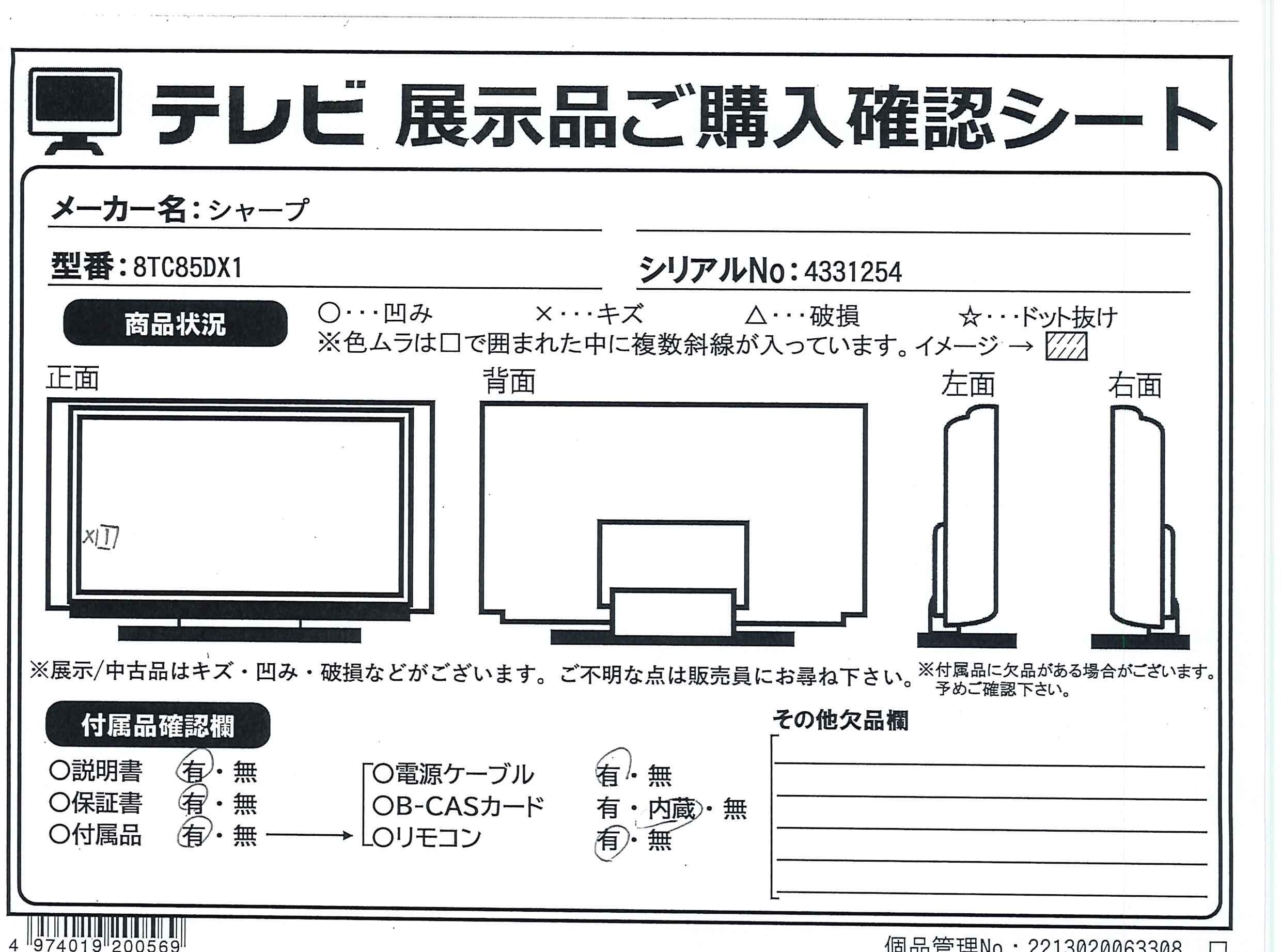 中古商品ランクについて 付属品・商品状態について 〔付属品〕取扱説明書、かんたん使い方ガイド、リモコン、単4乾電池2本、スタンドネック、スタンドベース、スタンド用ネジM4×8本、転倒防止ワイヤー、転倒防止ワイヤー取付ネジ2本、ホルダー、電源コード