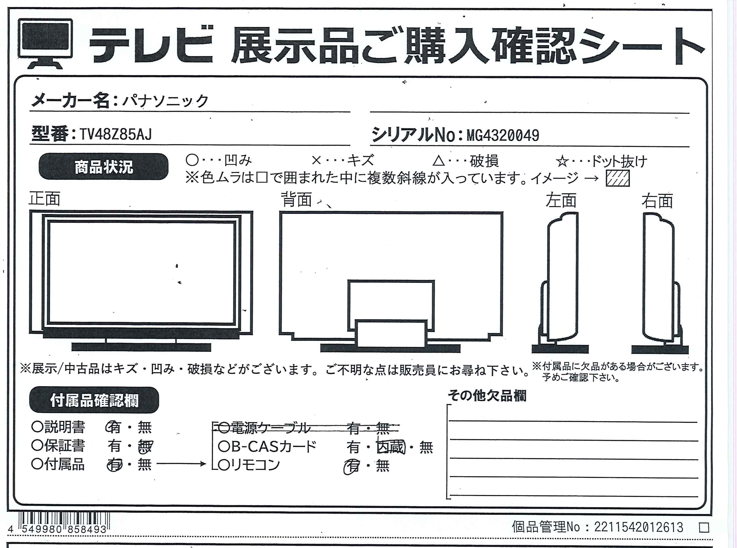 中古商品ランクについて 付属品・商品状態について 〔付属品〕取扱説明書、スタートガイド、リモコン、リモコン用単4形乾電池×2、組み立て部品一式、転倒・落下防止部品一式