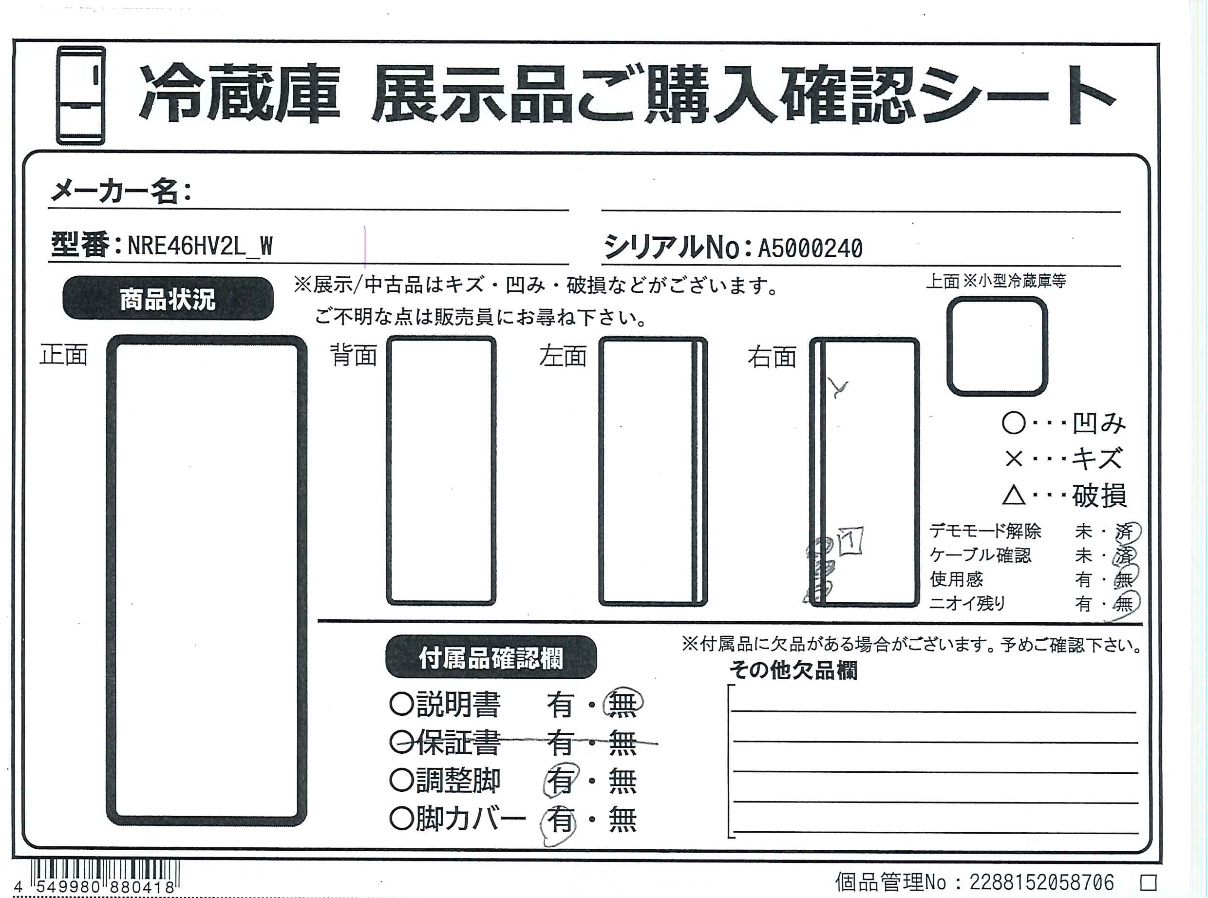 中古商品ランクについて 付属品・商品状態について 〔付属品〕給水タンク、浄水フィルター、卵トレイ、アルミプレート(パーシャル)、アイスシャベル、お掃除らくらくトレイ、アルミプレート(クーリングアシストルーム)、調整脚