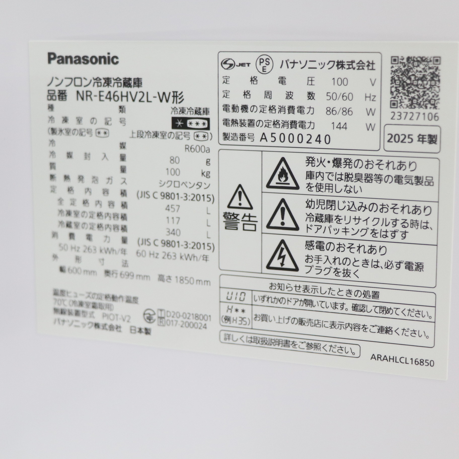 〔中古品〕 冷蔵庫 HVタイプ パールホワイト NR-E46HV2L-W [幅60cm /457L /5ドア /左開きタイプ /2025年]