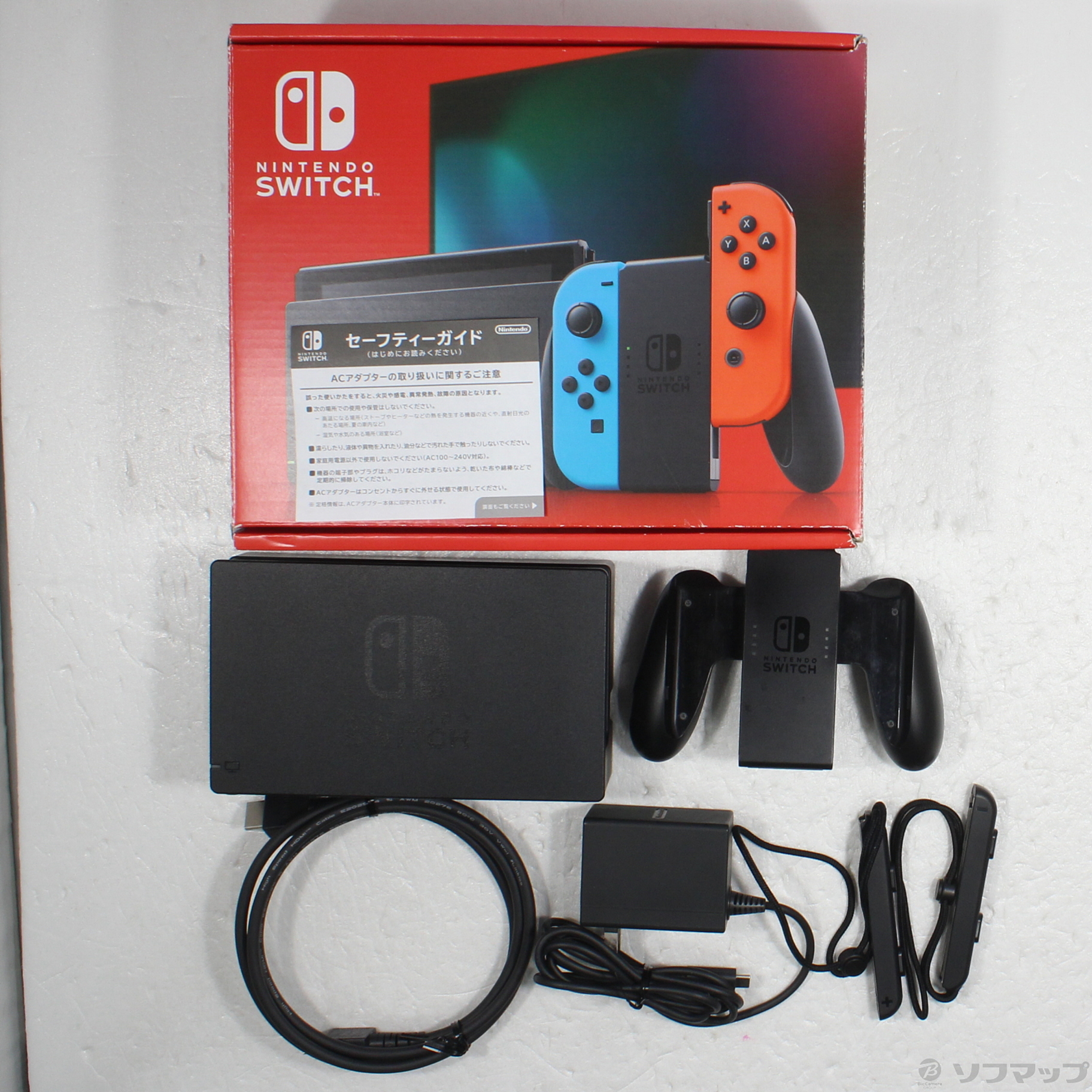 〔付属品〕箱、セーフティーガイド、ACアダプター、Joy-Con 右 ネオンレッド、Joy-Conグリップ、Joy-Con 左 ネオンブルー、Nintendo Switchドック、Joy-Conストラップ 左、Joy-Conストラップ 右、背面スタンド、HDMIケーブル
