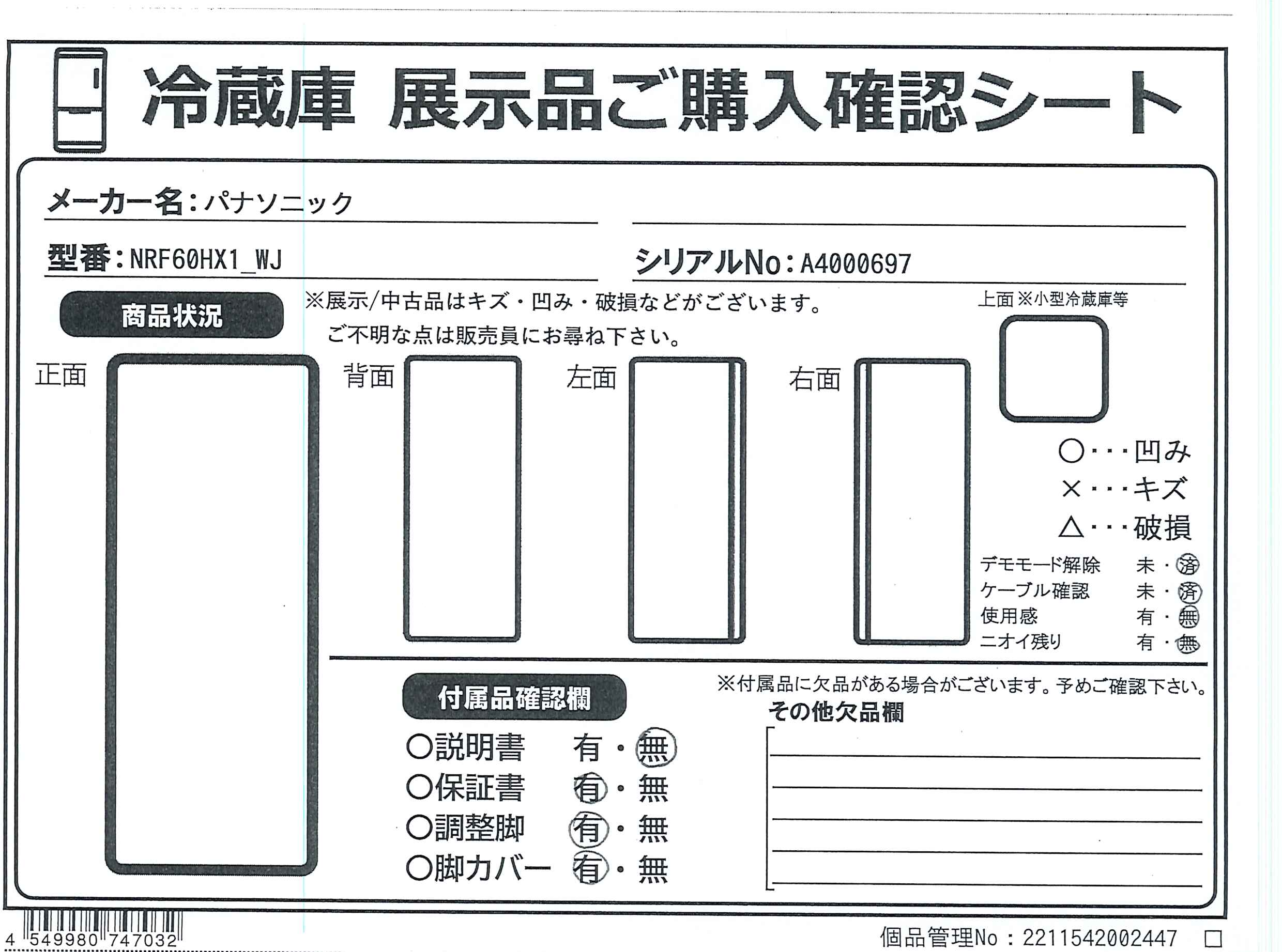 中古商品ランクについて 付属品・商品状態について 〔付属品〕脚カバー、調節脚×2、専用工具、卵トレイ、アルミ冷却プレート、アルミプレート、給水タンク、浄水フィルター、アイスシャベル、防音マット、製氷皿、ボトルサポーター