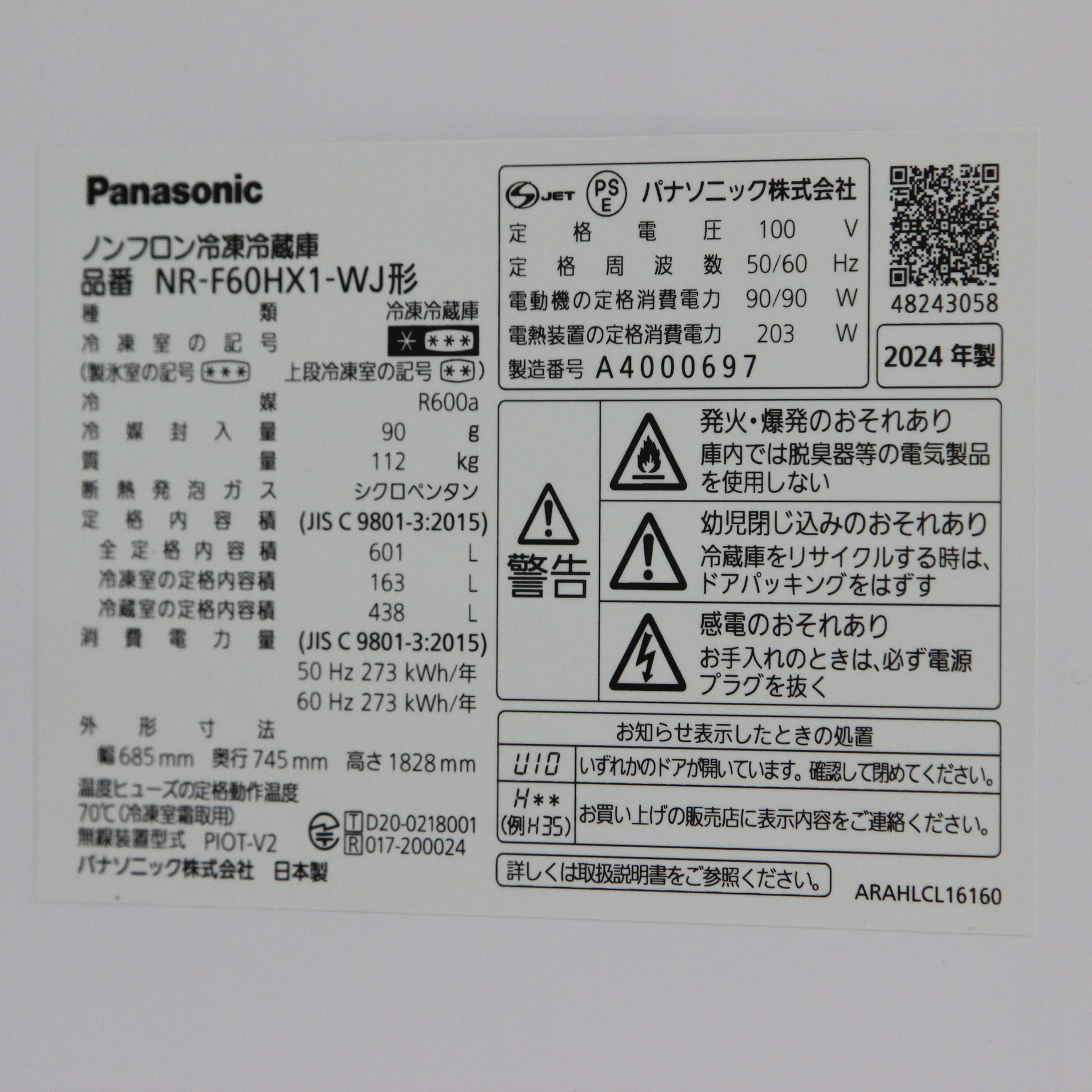 〔展示品〕 HXタイプ アルベロオフホワイト NR-F60HX1-WJ [6ドア /観音開きタイプ /2024年]