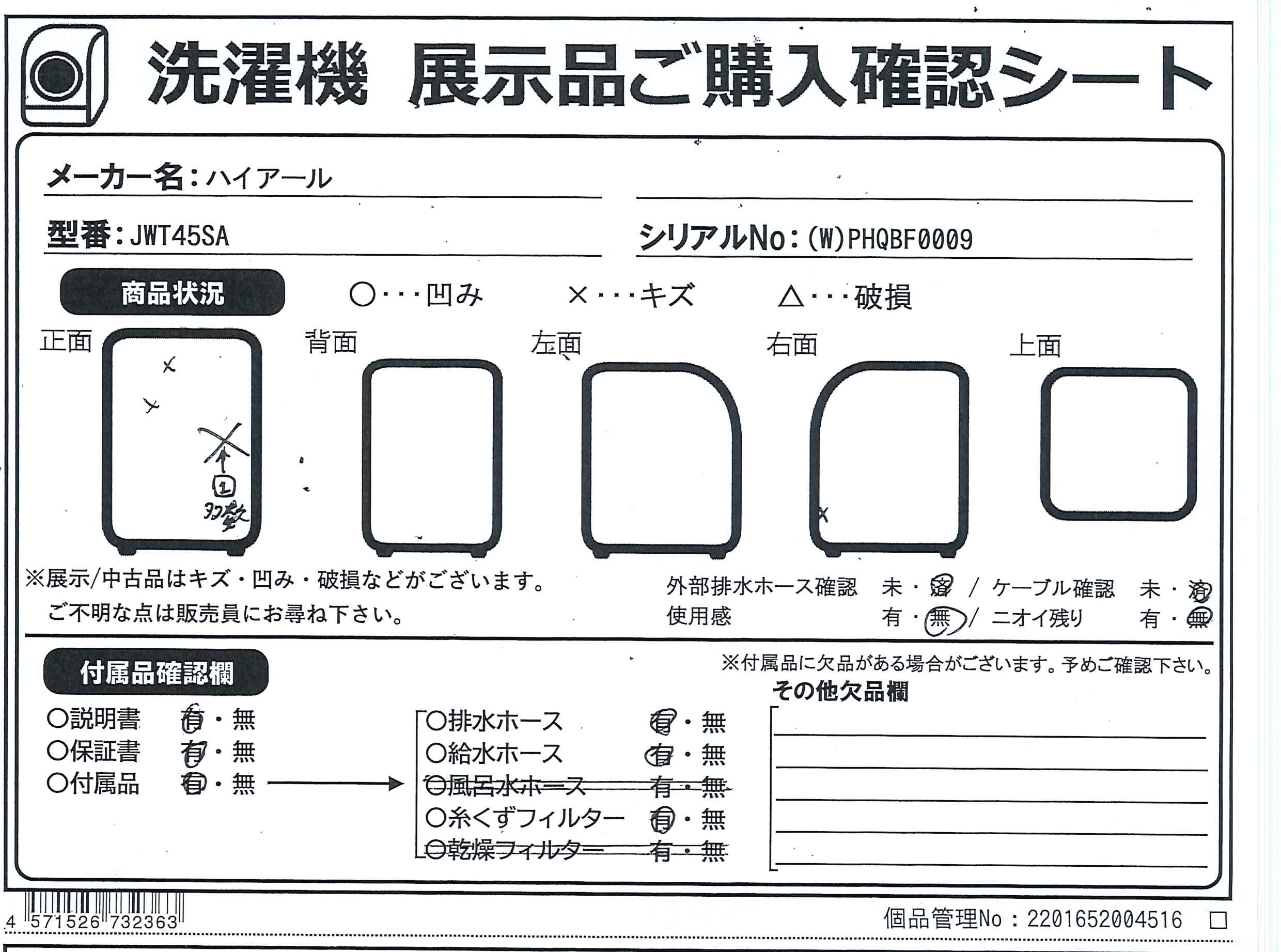 商品名 〔展示品〕 ドラム式洗濯機 ホワイト JW-T45SA [洗濯4.5kg /乾燥機能無 /左開き]