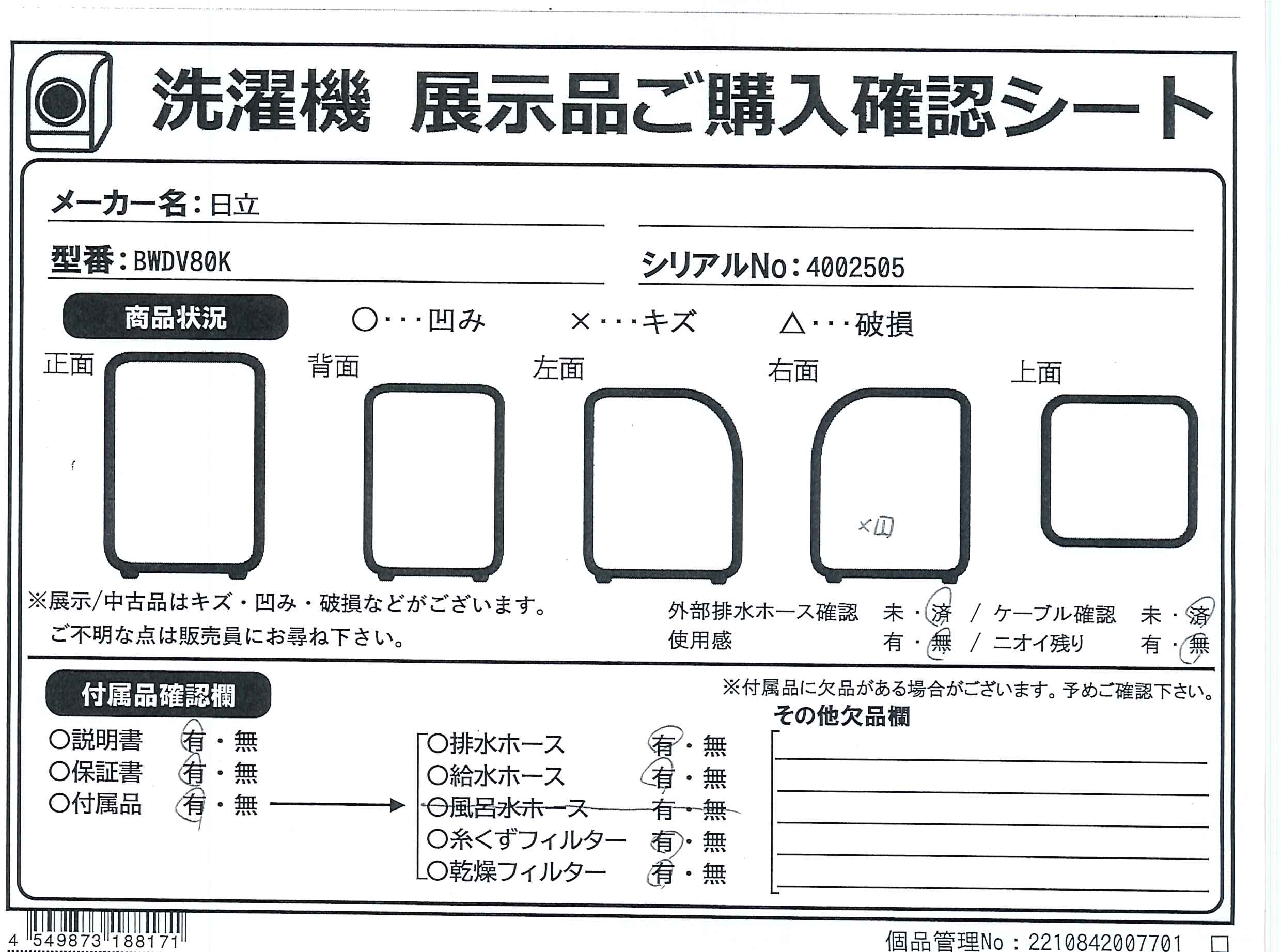 中古商品ランクについて 付属品・商品状態について 〔付属品〕取扱説明書、据付説明書・据付チェックシート、給水ホース