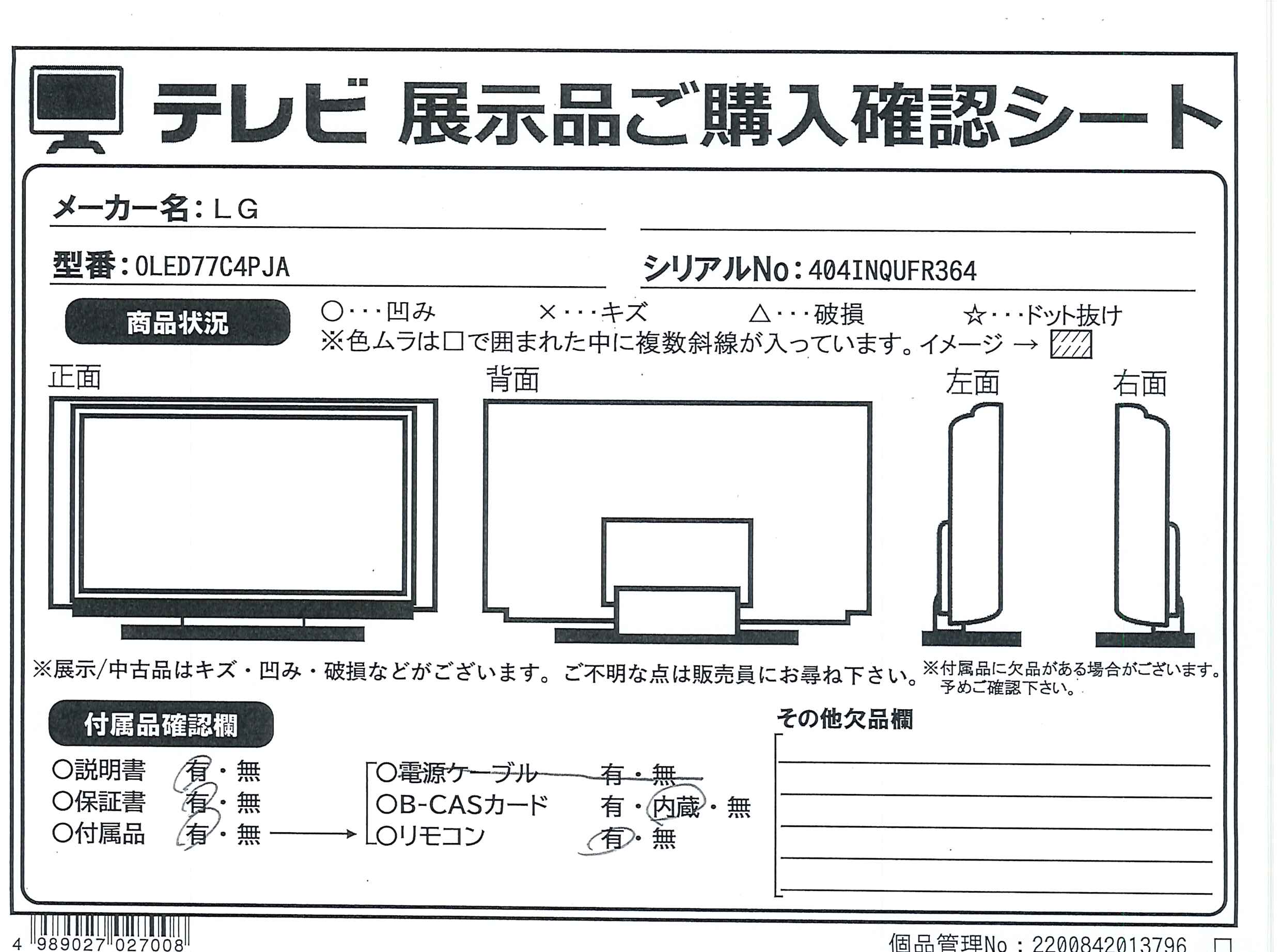 〔展示品〕 有機ELテレビ OLED77C4PJA [77V型 /Bluetooth対応 /4K対応 /BS・CS 4Kチューナー内蔵 /YouTube対応]
