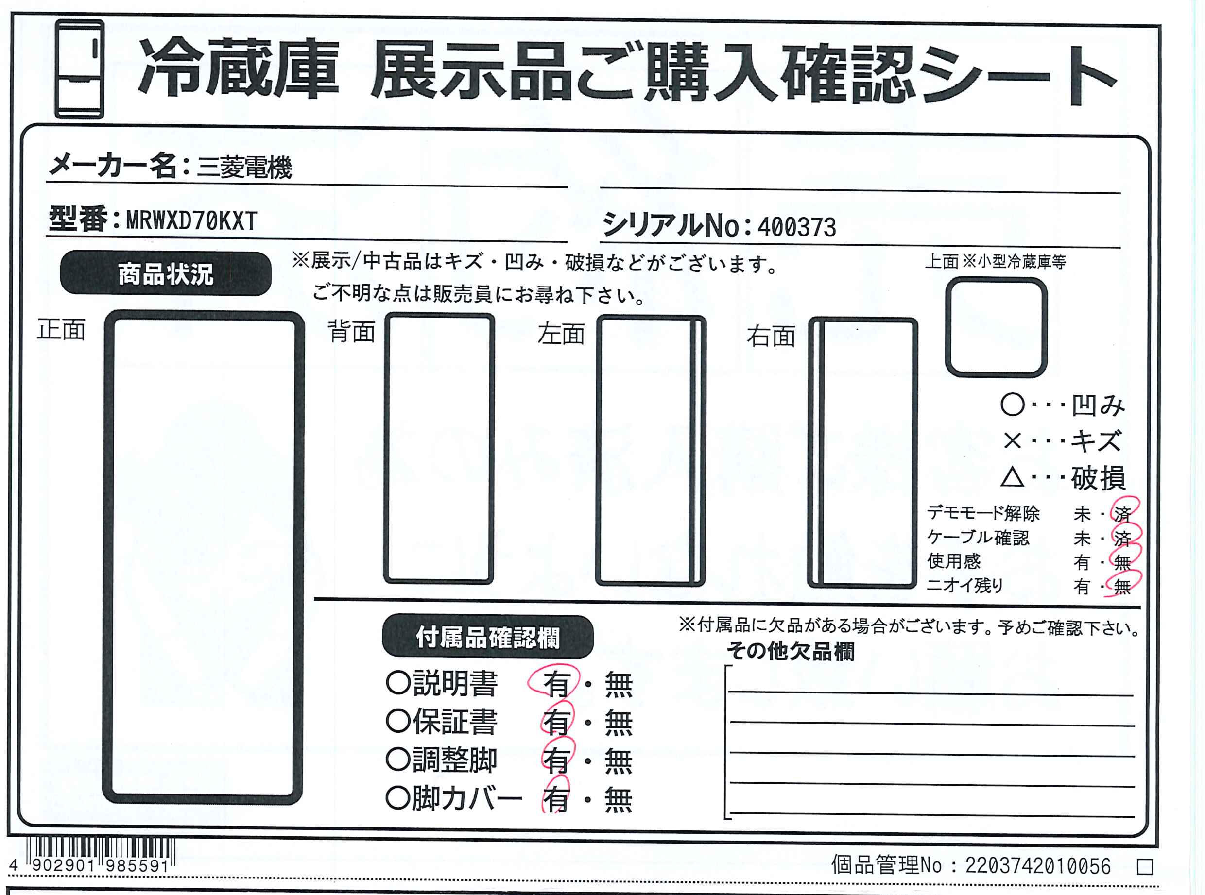 中古商品ランクについて 付属品・商品状態について 〔付属品〕取扱説明書、ガラスシェルフ(上)、ガラスシェルフ(中)、ガラスシェルフ(下)、仕切り、スライドシェルフ(前)、スライドシェルフ(奥)、ワイドチルドケースフタ、ワイドチルドケース、氷点下ストッカーケース、給水タンク、チェンジポケット(大)×2、チェンジポケット(小)×2、フリータマゴケース、タマゴトレイ、ボトルポケット(大)、ボトルポケット(小)、フリーケース(小)、ストッパー、製氷皿、帳氷箱、防音マット、アイスサーバー、瞬冷凍室ケース、アルミトレイ、フリージングケース(上)、フリージングケース(下)、野菜ケース、スライドケース、野菜ケース仕切り、脚カバー、調整脚用工具セット