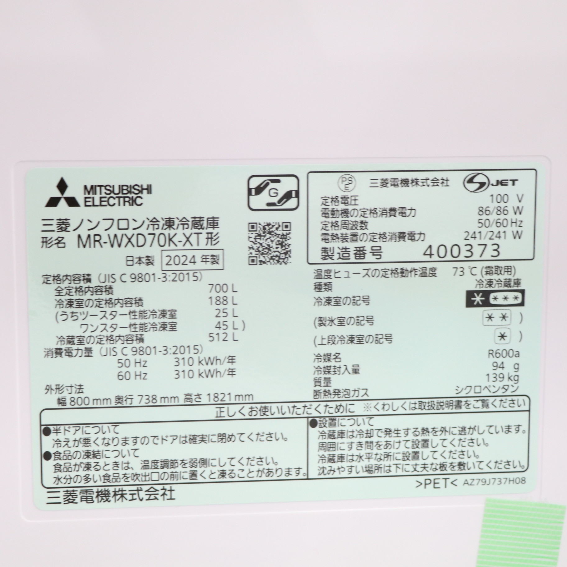 〔展示品〕 冷蔵庫 置けるスマート大容量 WXDシリーズ(プレミアムフレンチモデル) フロストグレイブラウン MR-WXD70K-XT [幅80cm /700L /6ドア /観音開きタイプ /2024年]