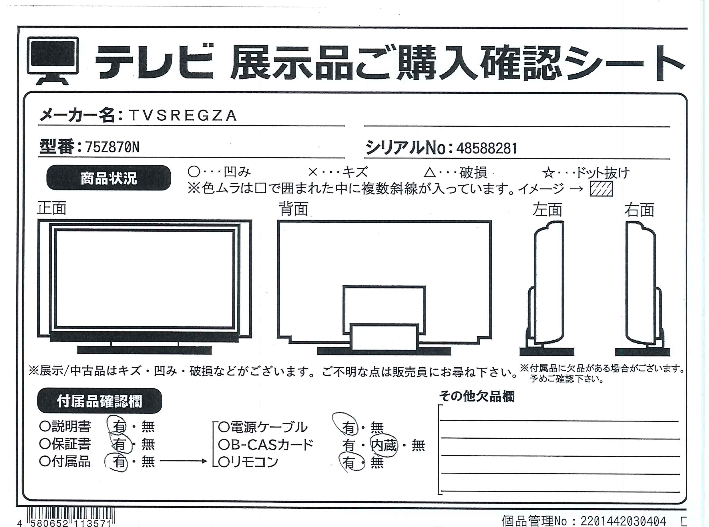 中古商品ランクについて 付属品・商品状態について 〔付属品〕説明書、支柱、スタンドベース、スタンド組立・取付ネジX8、リモコン、リモコン用単4形乾電池X2、電源コード、転倒防止バンド、ネジ(長)、ネジ(短)、コードクランプ