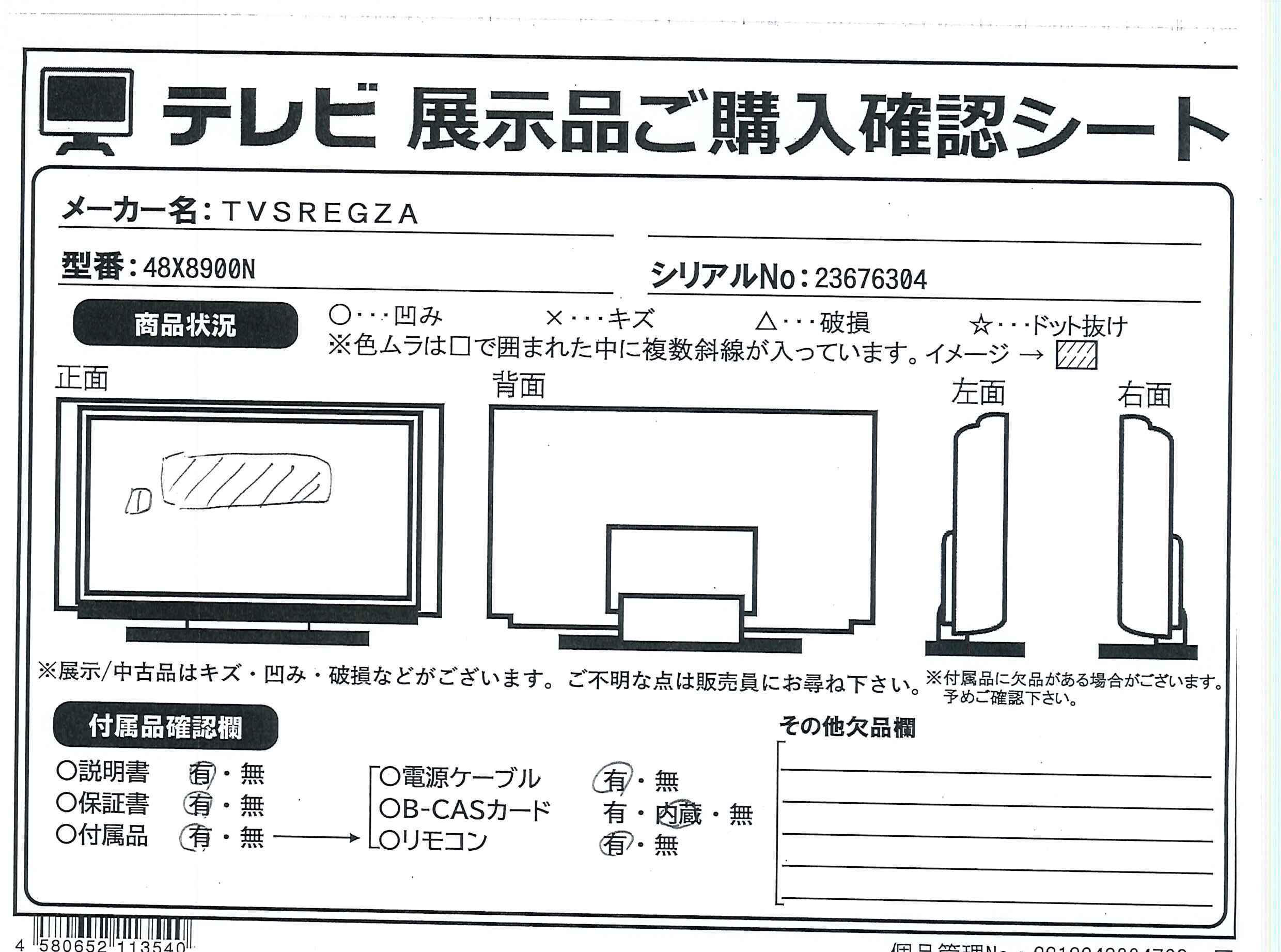 中古商品ランクについて 付属品・商品状態について 〔付属品〕取扱説明書、スタンド一式、リモコン(CT-90505)、単四形乾電池×2、電源コード、ネジ(長)、ネジ(短)、転倒防止バンド、コードクランプ、背面カバー