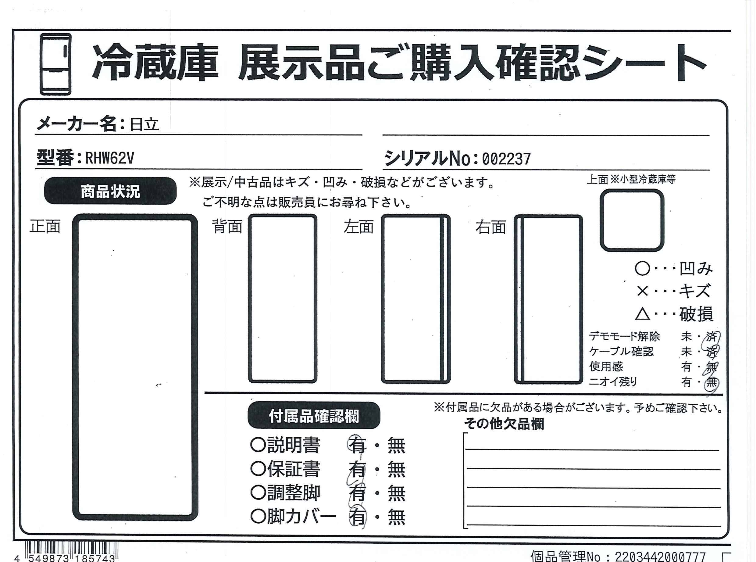 中古商品ランクについて 付属品・商品状態について 〔付属品〕説明書、調節脚×2、クッション×2、脚カバー、小物ケース、卵スタンド、給水タンク一式、製氷スコップ、大型アルミトレイ