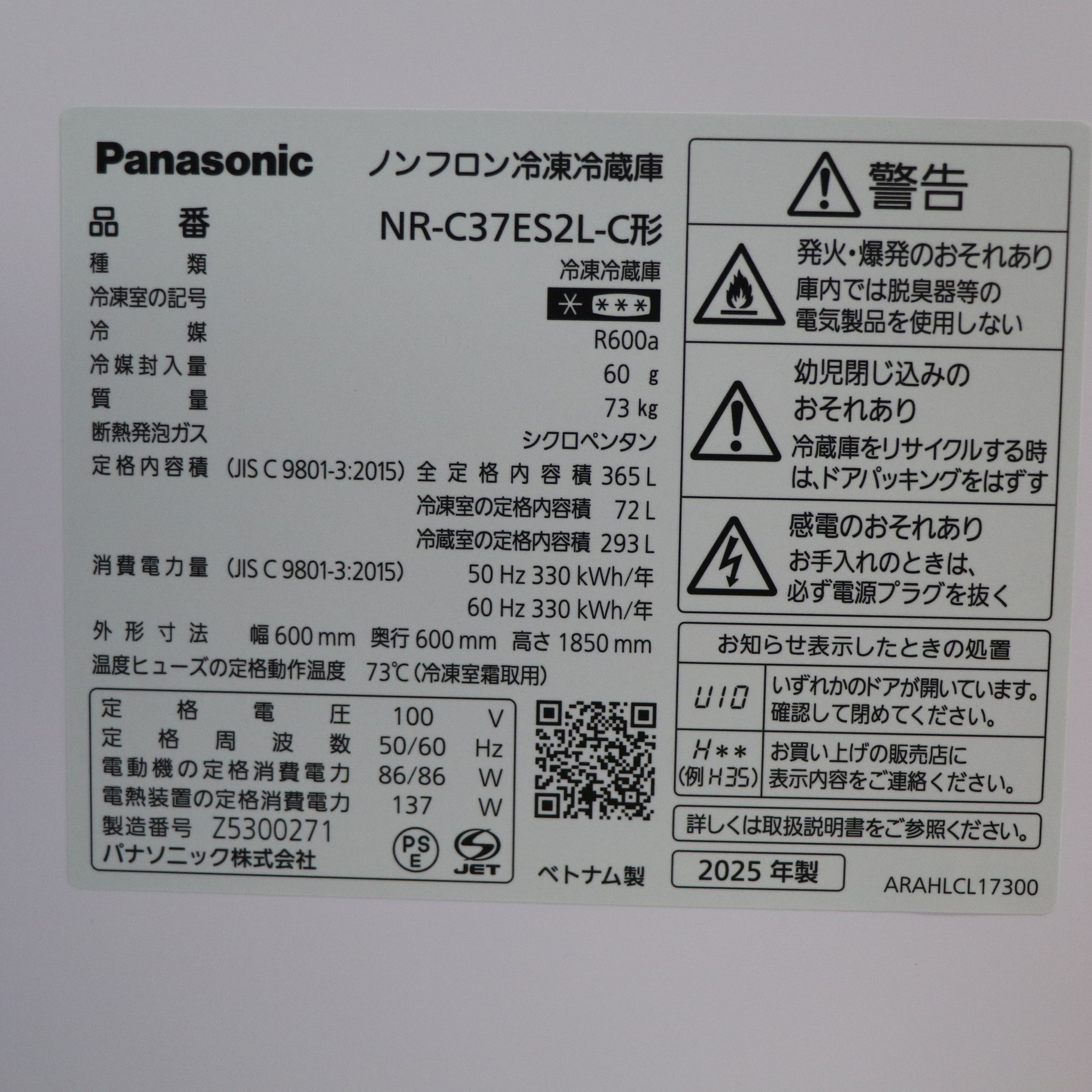 〔中古品〕 冷蔵庫 ESタイプ マットベージュ NR-C37ES2L-C [幅60cm /365L /3ドア /左開きタイプ /2025年]