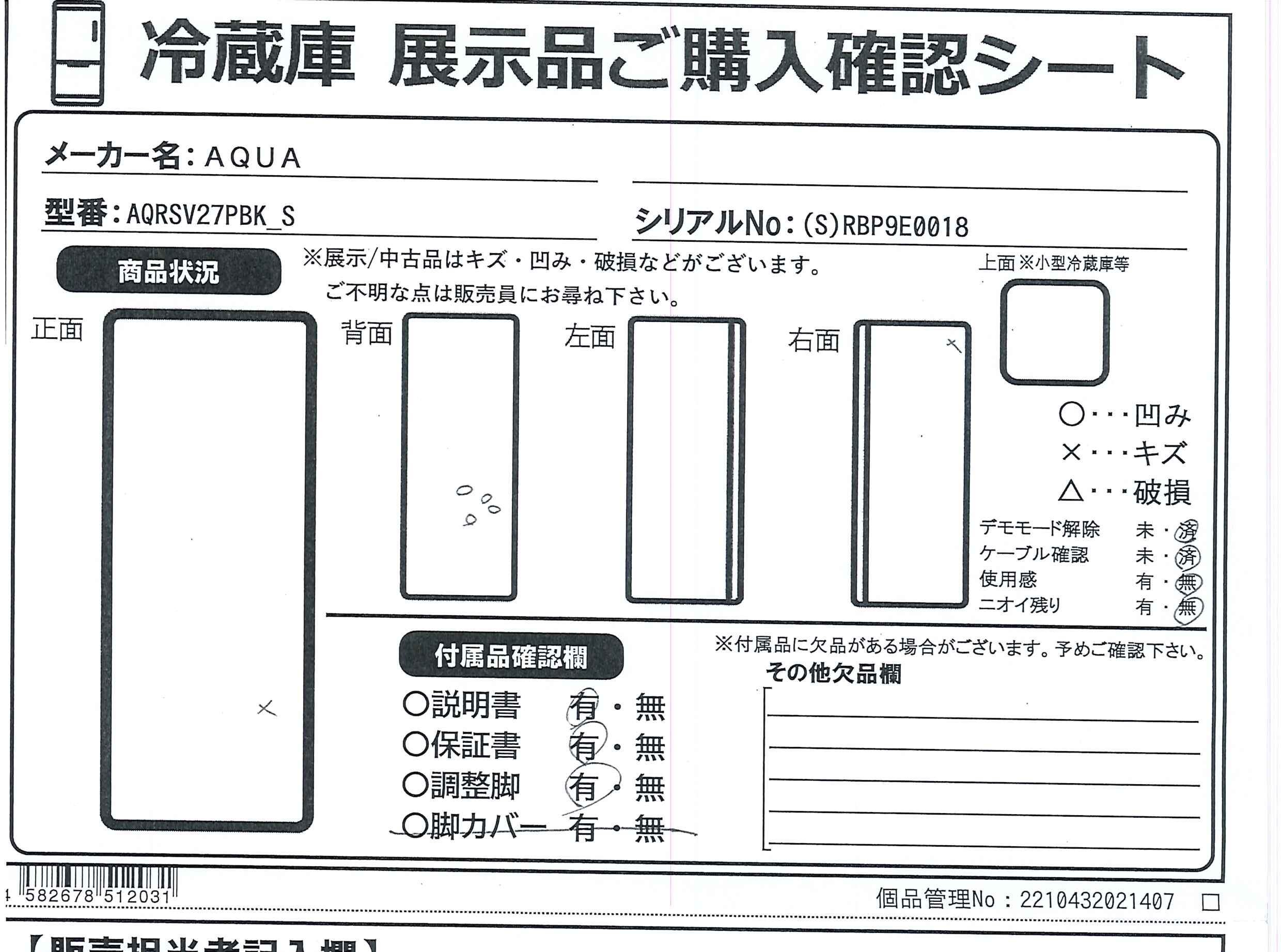 ▼同型番の新品商品はこちら![]() AQUA 冷蔵庫 ブライトシルバー AQR-SV27PBK(S) [幅60cm /272L /3ドア /右開きタイプ /2023年] 【基本設置料金セット】 ¥104,800(税込) 10,480ポイントサービス 在庫限り |