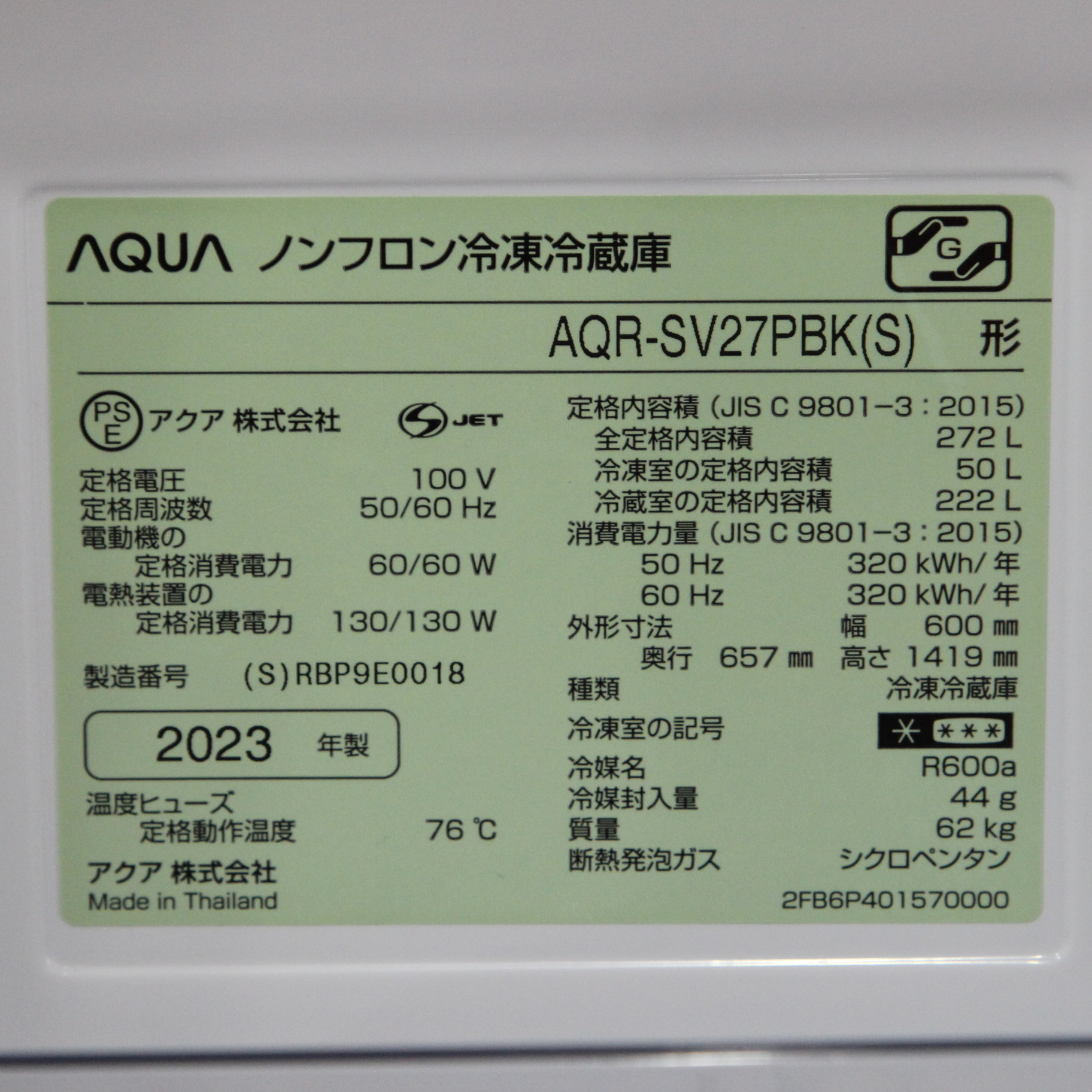 〔展示品〕 冷蔵庫 ブライトシルバー AQR-SV27PBK(S) [幅60cm /272L /3ドア /右開きタイプ /2023年]