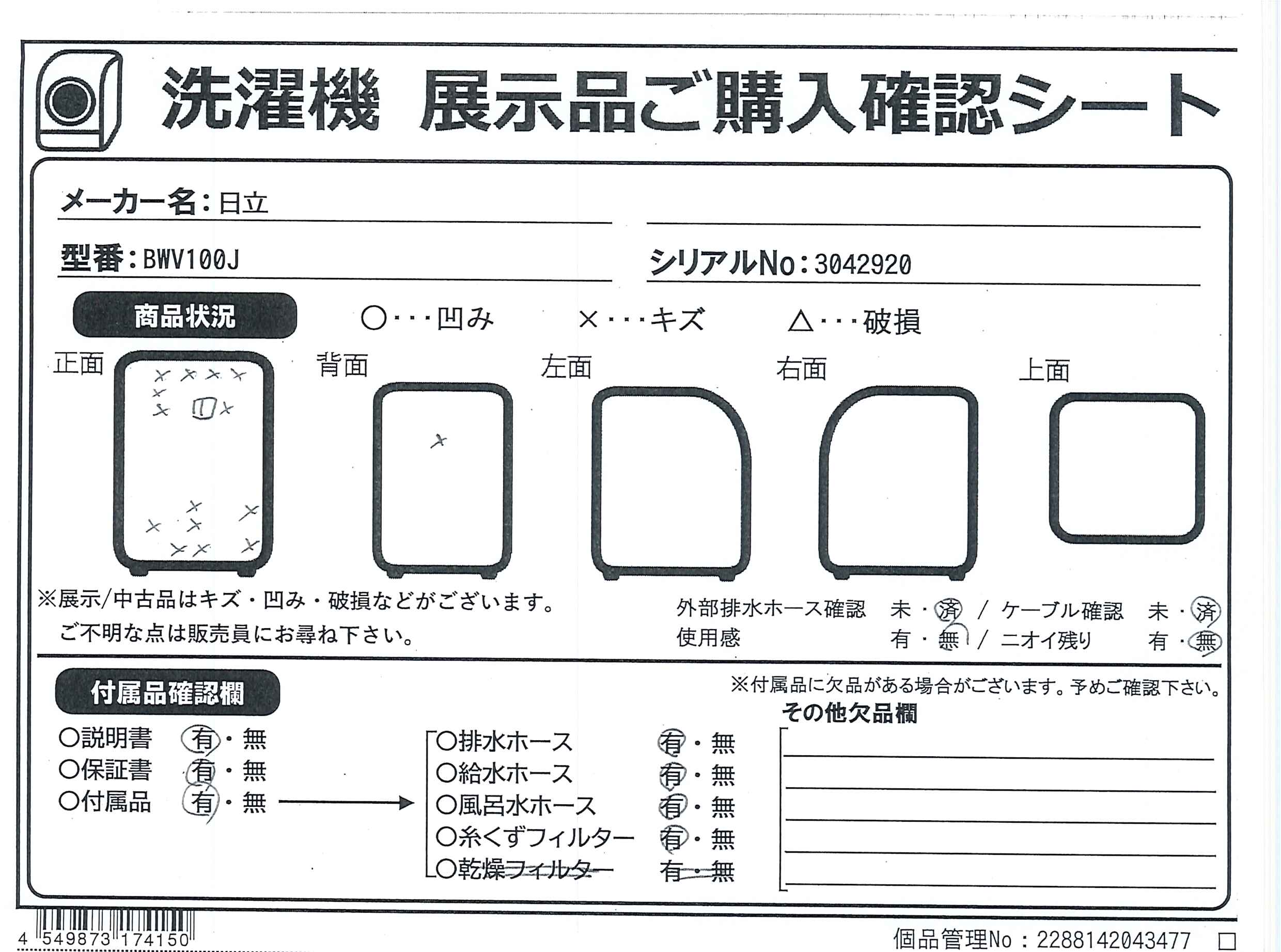 中古商品ランクについて 付属品・商品状態について 〔付属品〕説明書、給水ホース、保護カバー、お湯取ホース、クリーンフィルター、お湯取ホース掛け、脚キャップ(4mm)、脚キャップ(8mm)、据付説明書・据付チェックシート、糸くずフィルター×2