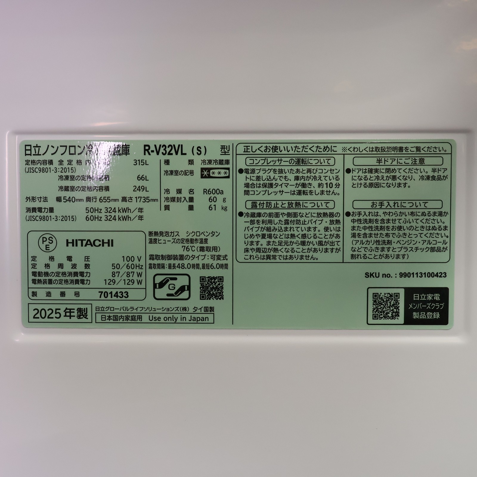 〔中古品〕 冷蔵庫 Vタイプ グラファイトシルバー R-V32VL-S [幅54cm /315L /3ドア /左開きタイプ /2024年]