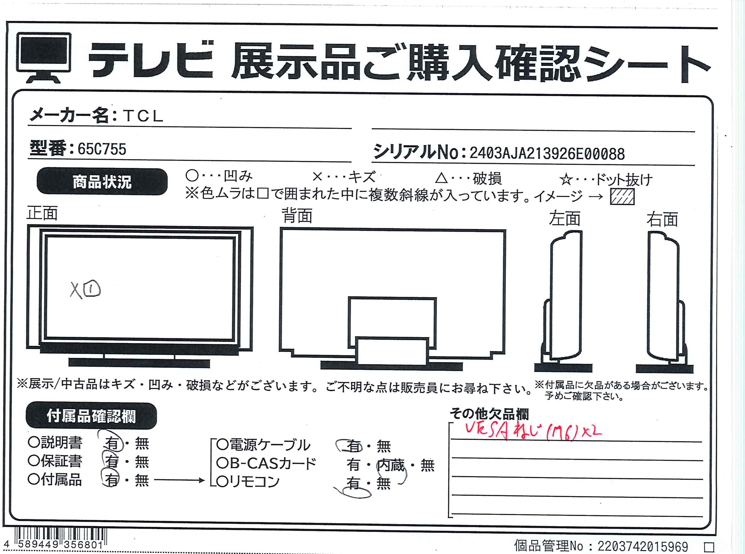中古商品ランクについて 付属品・商品状態について 〔付属品〕取扱説明書、かんたんガイド、標準リモコン、単四形乾電池×2、電源コード、スタンド一式、VESAネジ(M6)×2、ネジ(ST4)、クリップ×3