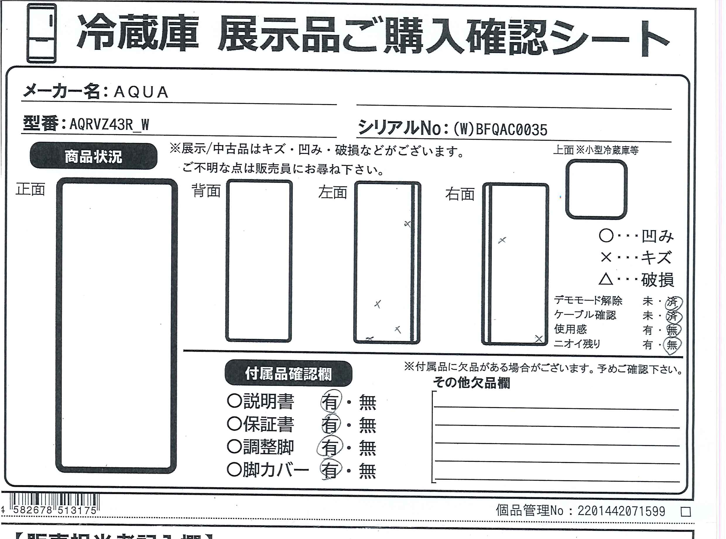 中古商品ランクについて 付属品・商品状態について 〔付属品〕説明書、ガラス棚(ノーマル)、ガラス棚(ハーフ)×2、チルドケース、給水タンク、ベジチルドケース、マルチポケット(小)、マルチポケット(大)、ワイドマルチポケット、卵皿&チューブスタンド、ボトル&ドレッシングポケット、野菜ケース、バスケット(野菜室)、おそうじ栓、冷凍ケース(上)、アイストレイ、製氷ユニット、氷スコップ、冷凍ケース(下)、バスケット(冷凍室)、フリージングトレイ、キックプレート、調節脚×2