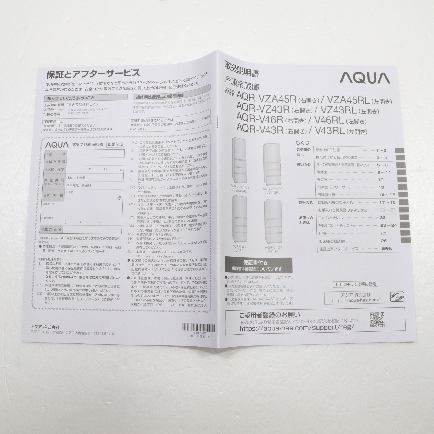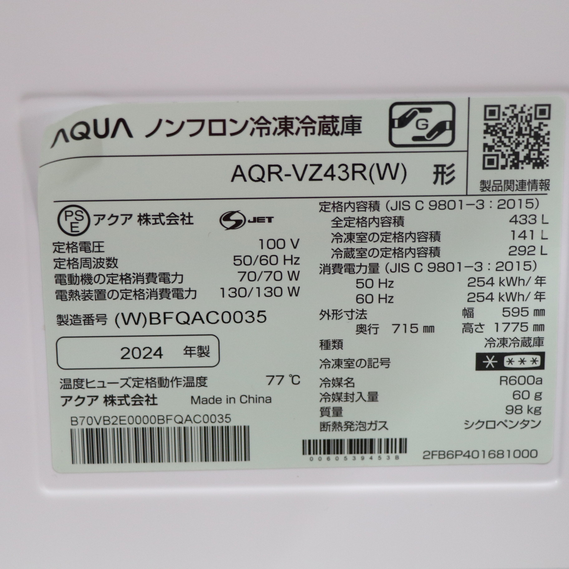 〔展示品〕 冷蔵庫 DELIE Plus(デリエプラス)シリーズ クリアシェルホワイト AQR-VZ43R-W [幅59.5cm /433L /4ドア /右開きタイプ /2024年]
