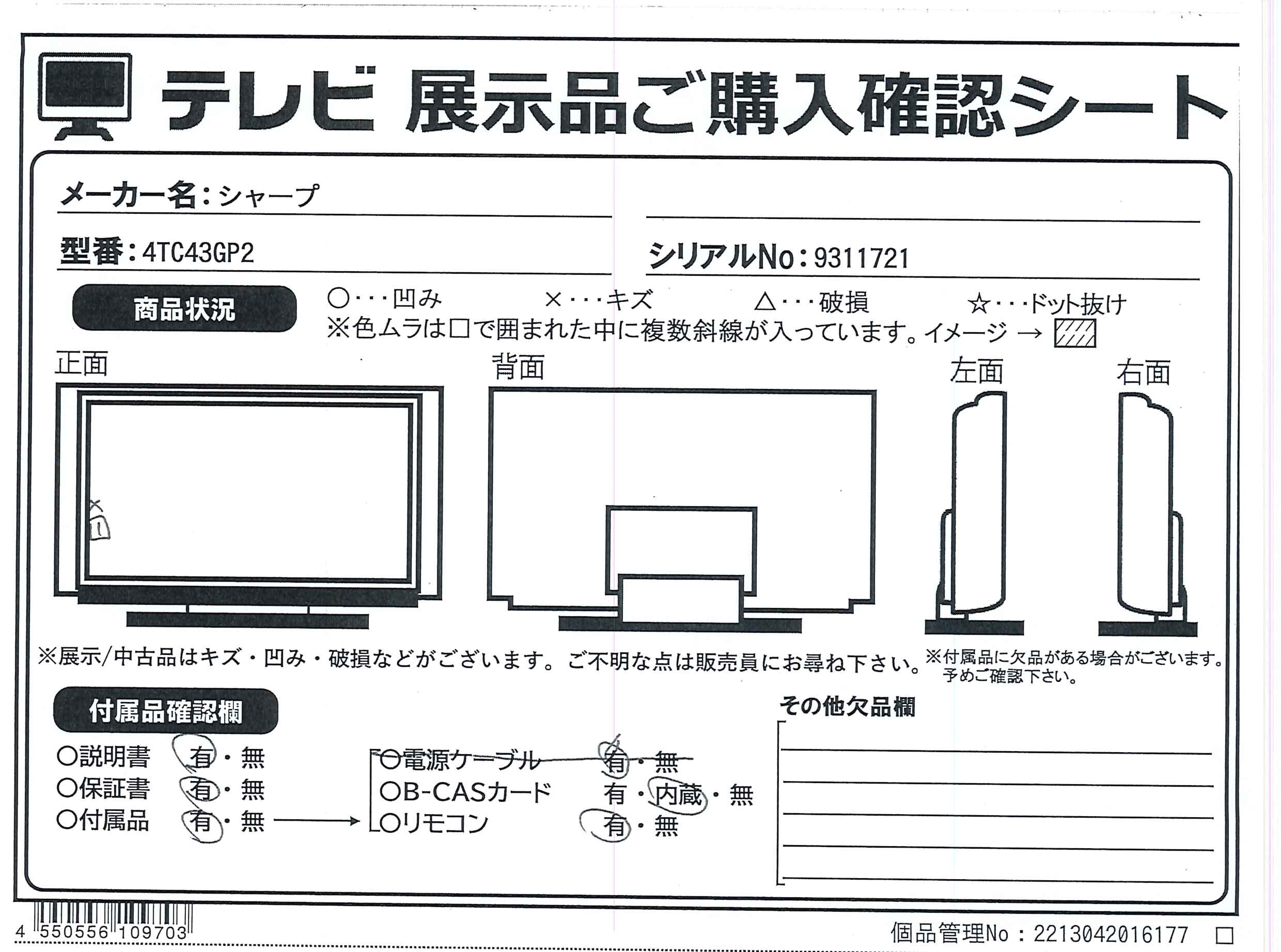 中古商品ランクについて 付属品・商品状態について 〔付属品〕説明書、スタンド取付金具、スタンドカバー、スタンドベース、スタンド取付用ネジ×4、スタンド組立用ネジ×4、転倒防止ベルト、転倒防止ベルトテレビ取付用ネジ、転倒防止ベルトテレビ台固定ネジ、スタンド回転ロックネジ