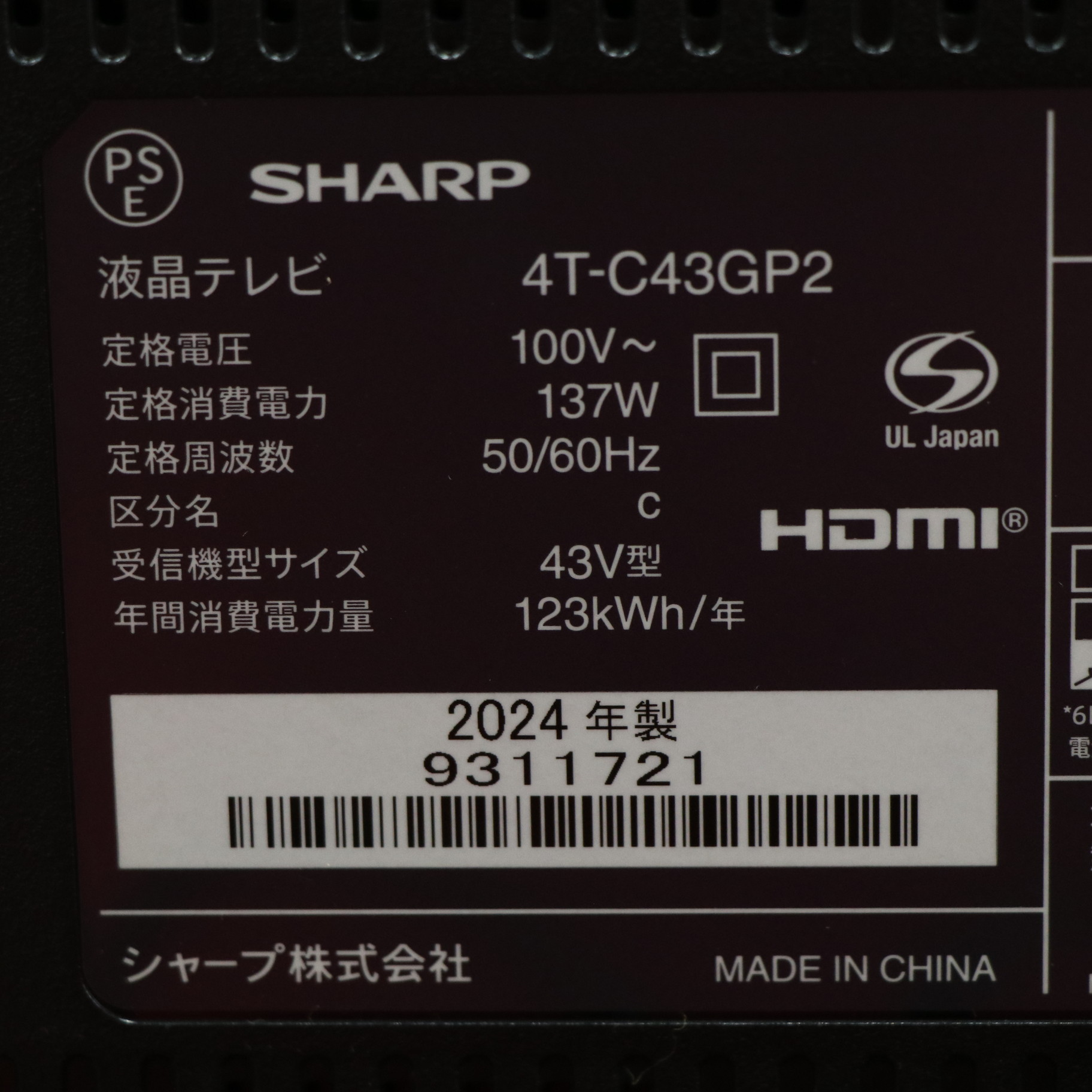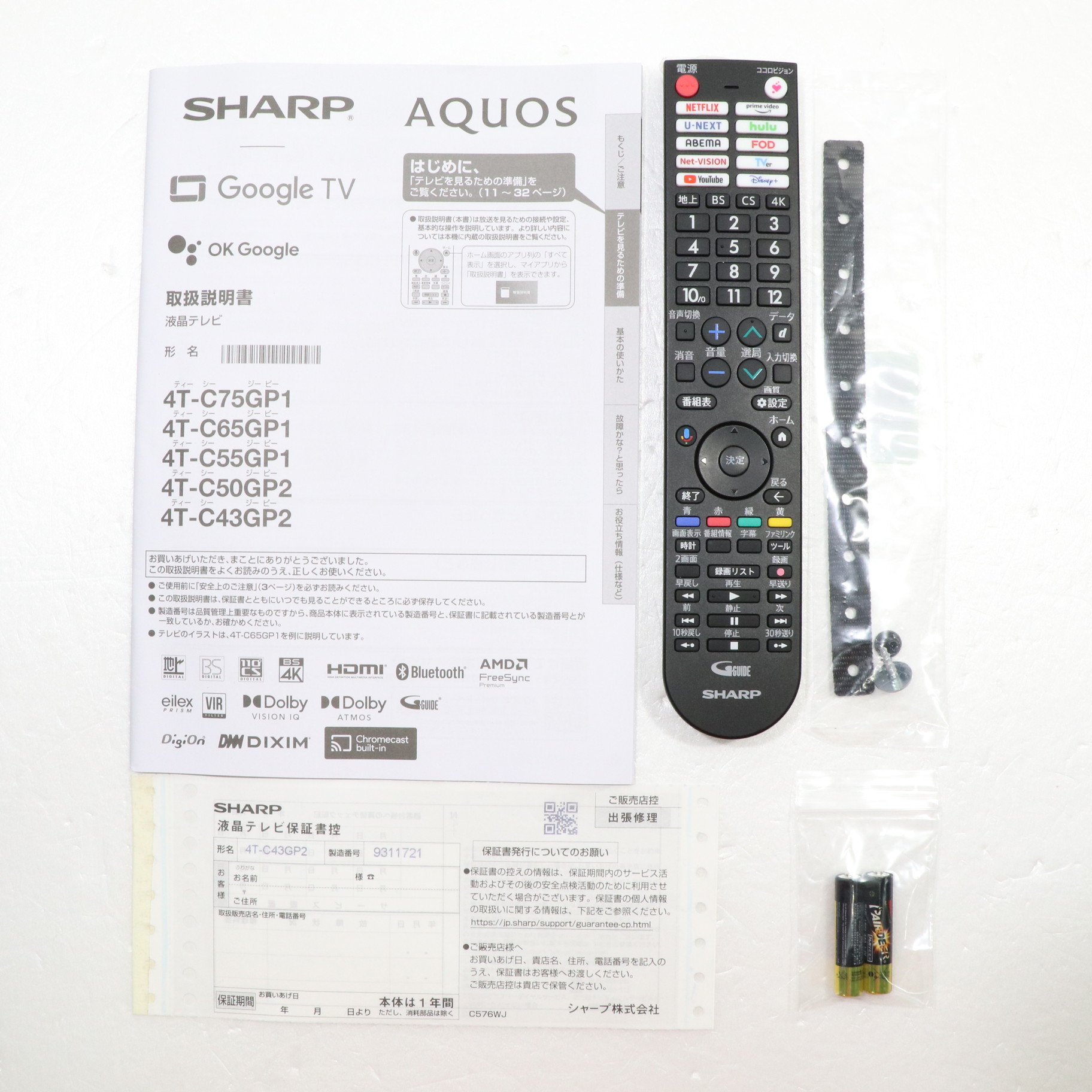 〔展示品〕 液晶テレビ AQUOS ブラック 4T-C43GP2 [Bluetooth対応 /4K対応 /BS・CS 4Kチューナー内蔵 /YouTube対応]