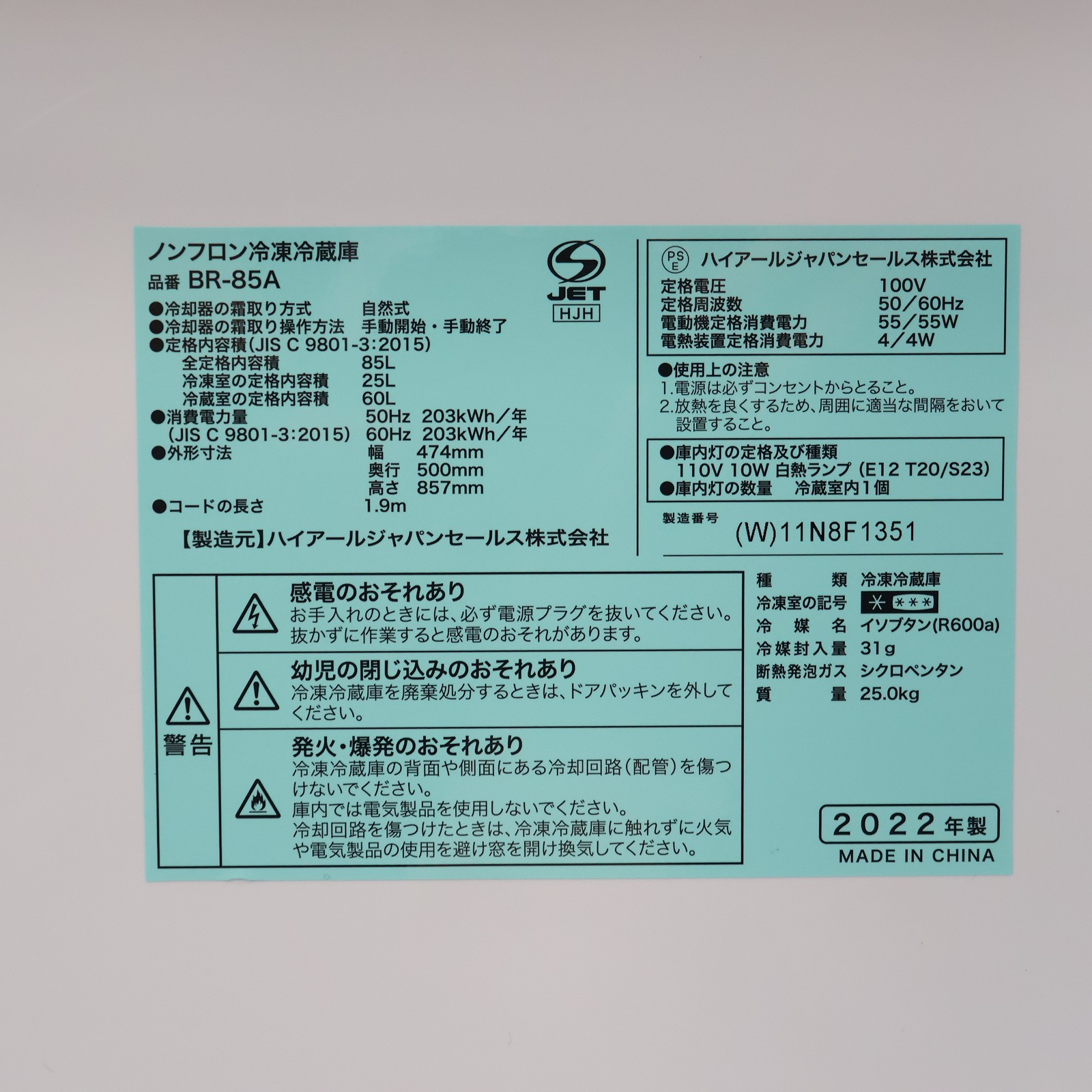 〔展示品〕 冷蔵庫 ホワイト BR-85A-W [幅47.4cm /85L /2ドア /右開きタイプ /2021年]