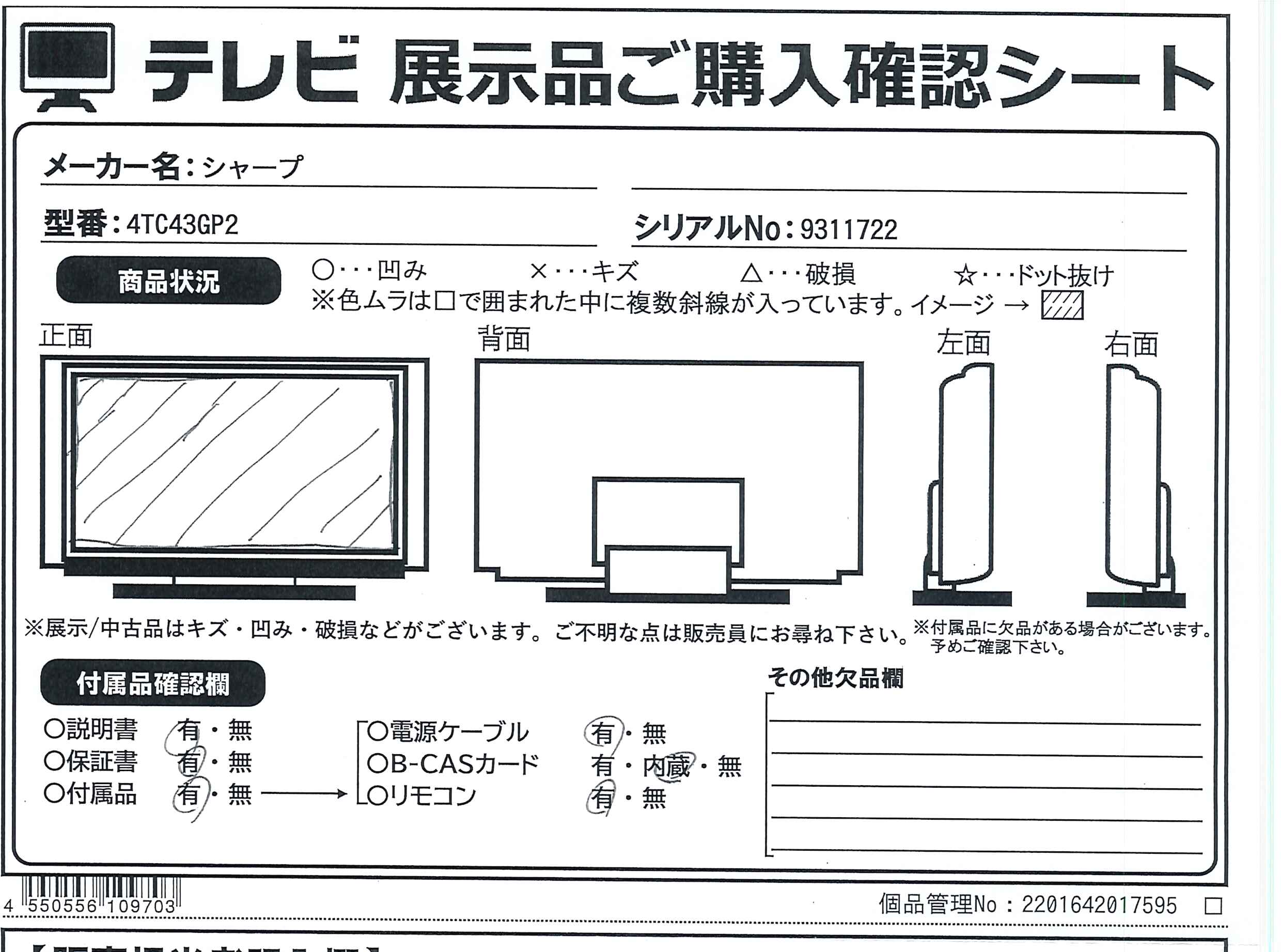 中古商品ランクについて 付属品・商品状態について 〔付属品〕説明書、スタンド取付金具、スタンドカバー、スタンドベース、スタンド取付用ネジ×4、スタンド組立用ネジ×4、転倒防止ベルト、転倒防止ベルトテレビ取付用ネジ、転倒防止ベルトテレビ台固定ネジ、スタンド回転ロックネジ、リモコン、リモコン用単4乾電池×2