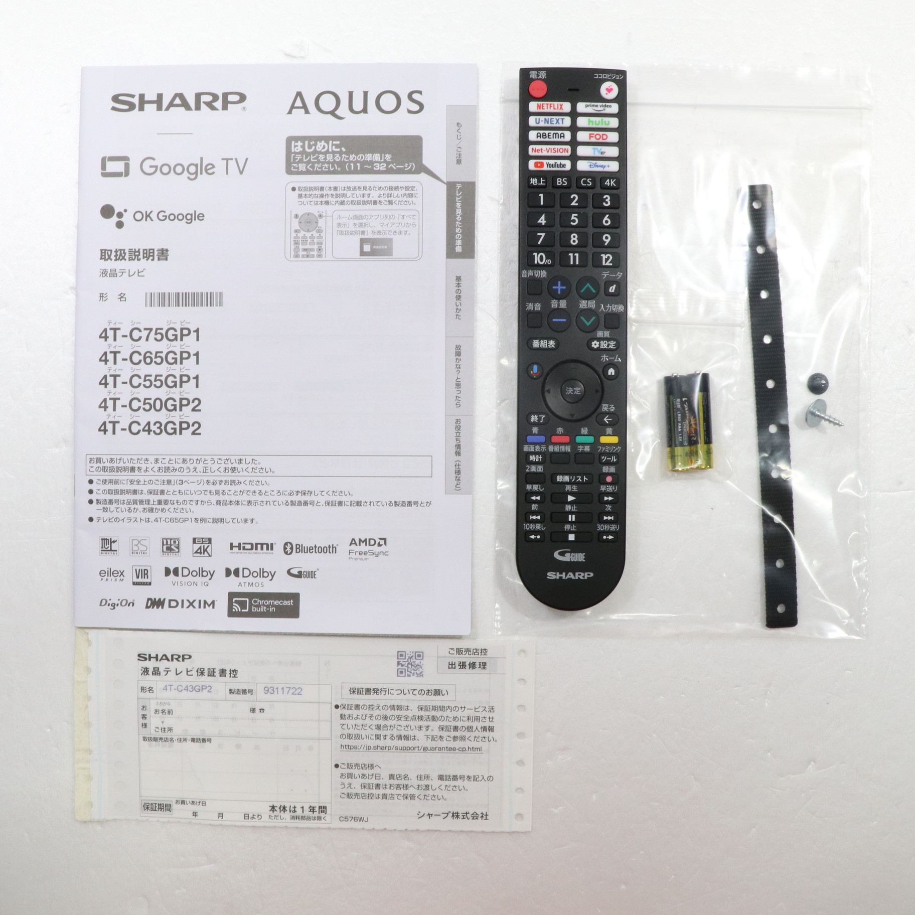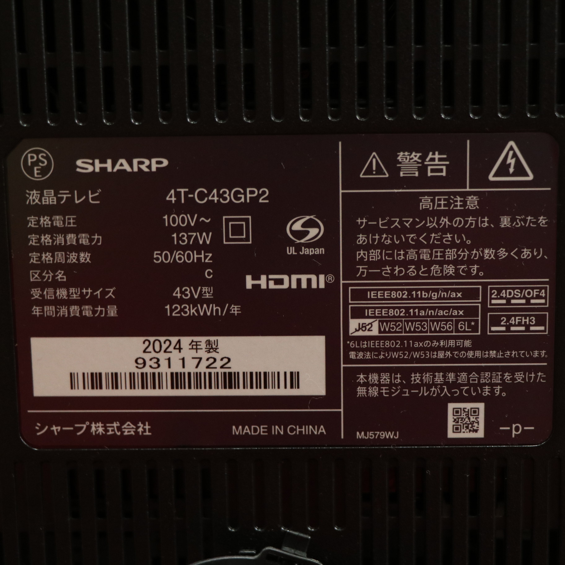 〔展示品〕 液晶テレビ AQUOS ブラック 4T-C43GP2 [Bluetooth対応 /4K対応 /BS・CS 4Kチューナー内蔵 /YouTube対応]