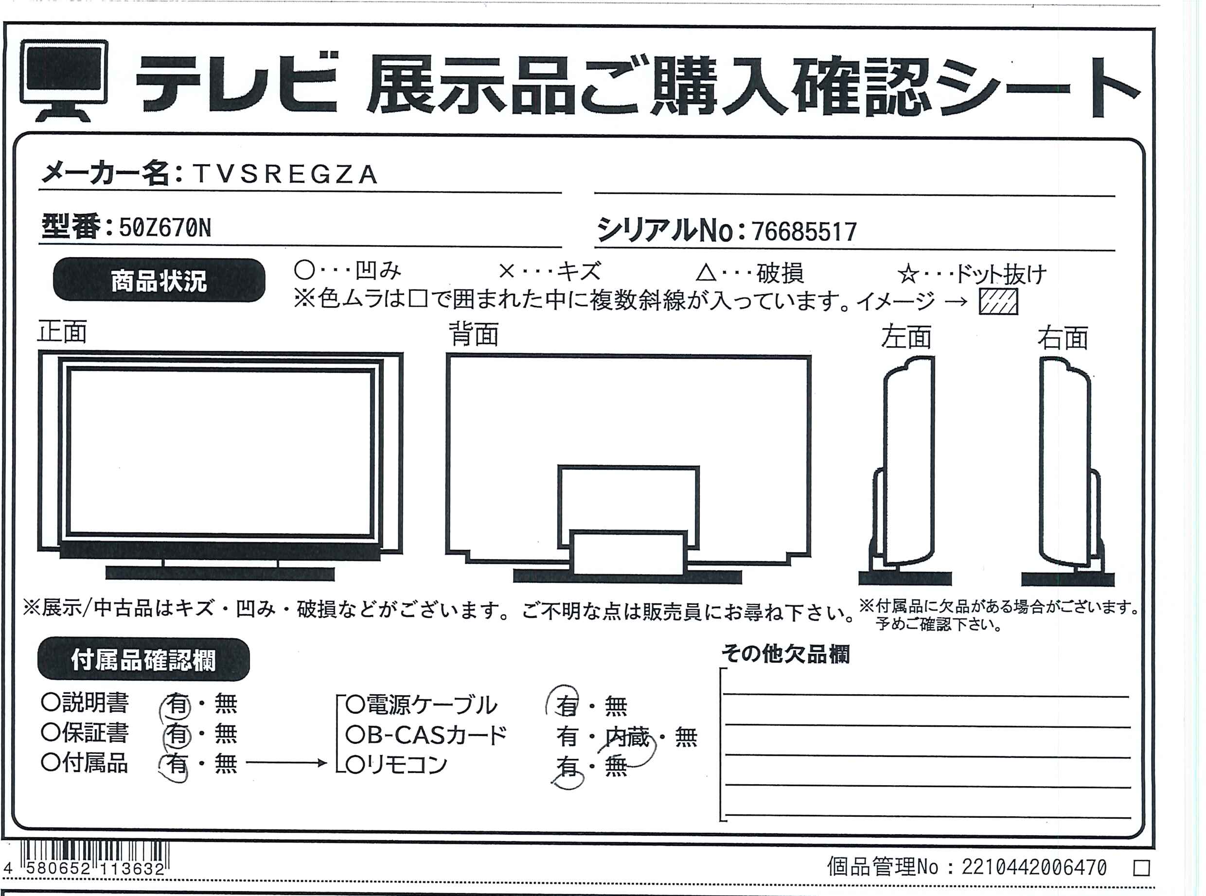 中古商品ランクについて 付属品・商品状態について 〔付属品〕取扱説明書、スタンド一式、リモコン、単四型乾電池×2、電源コード、ネジ(長)×1、ネジ(短)×1、転倒防止バンド×1、コードクランプ、スタンドカバー