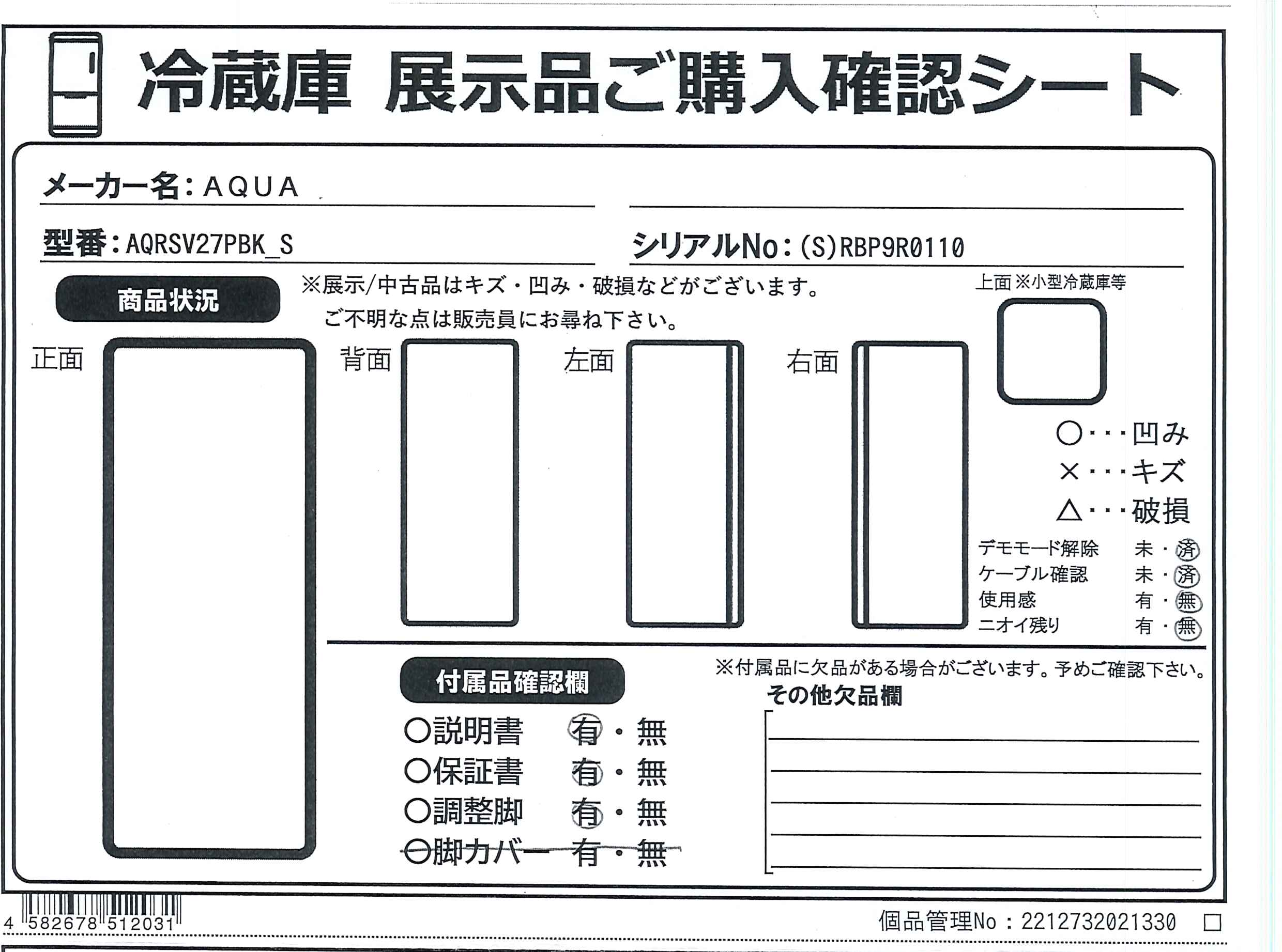 ▼同型番の新品商品はこちら![]() AQUA 冷蔵庫 ブライトシルバー AQR-SV27PBK(S) [幅60cm /272L /3ドア /右開きタイプ /2023年] 【基本設置料金セット】 ¥104,800(税込) 10,480ポイントサービス 在庫限り |
