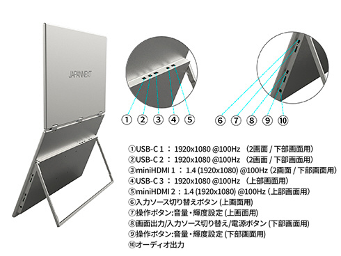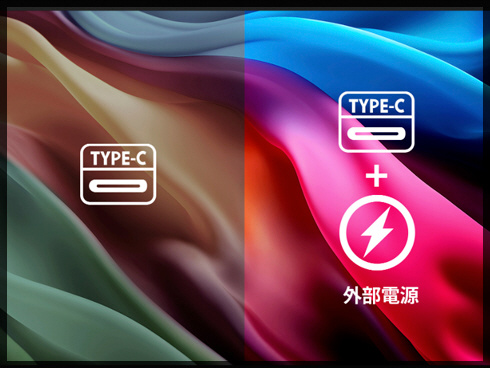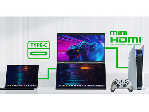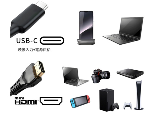 ■入力端子としてハイブリッド対応(モニターへの電源と映像を1本で送信)のUSB Type-C(全画面/下画面入力用)を2つ、USB Type-C(上画面入力用)を1つ、さらにminiHDMI 1.4を2つ装備します。*miniHDMI使用時にはUSB Type-C端子から電源供給が必要になります。