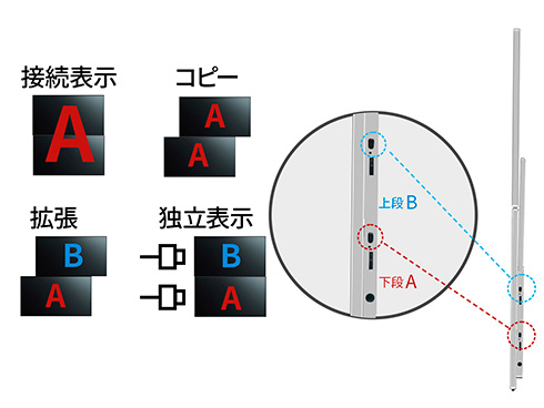 ■本体右側面の切り替えスイッチを使用することで、1920x1080解像度の2枚のスクリーンを、1920×2160の高解像度(実質24.5インチ)1枚の大画面として活用する「接続表示」モードと、2画面を別々のスクリーンとして使用する「拡張」モード、さらにPCと同じ画面を表示する「ミラー」モードを切り替えること事が可能です。