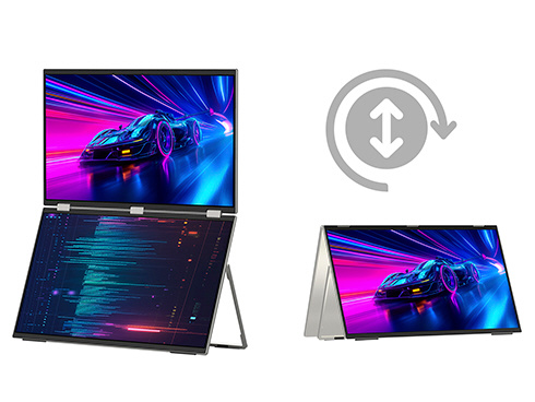 ■モニター本体に収納可能な自立式キックスタンドを搭載しており、どこでも手軽にマルチディスプレイ環境を構築できます。縦向き・横向きの両方に対応しており、用途に応じた柔軟な使い方が可能です。
