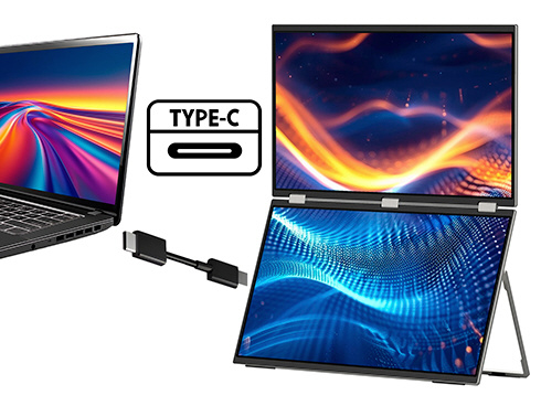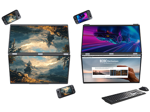■携帯性、収納性に優れており、ワーケーションや外出先、自宅のリビングなど、大きなディスプレイが置きづらい環境でも、USB-Cケーブル1本で簡単に最大3画面のマルチディスプレイ環境を構築できます。ノートPCのように折りたためるため、使用しない場合は収納しておくことができ、高い生産性と収納性を両立することができます。