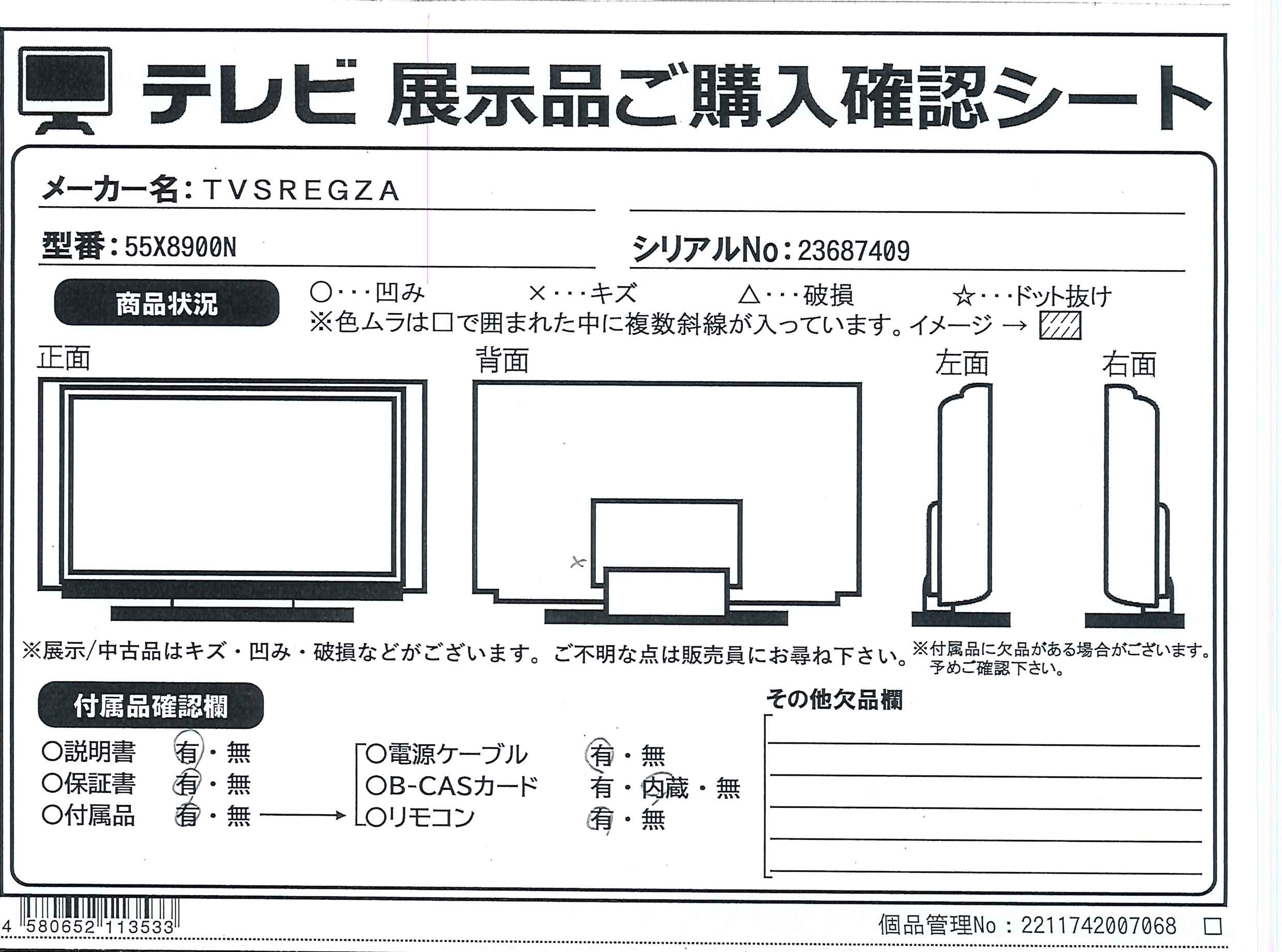 中古商品ランクについて 付属品・商品状態について 〔付属品〕説明書、スタンド一式、リモコン、単四形乾電池×2、電源コード、転倒防止バンド一式、コードクランプ、スタンドカバー、ケーブルカバー