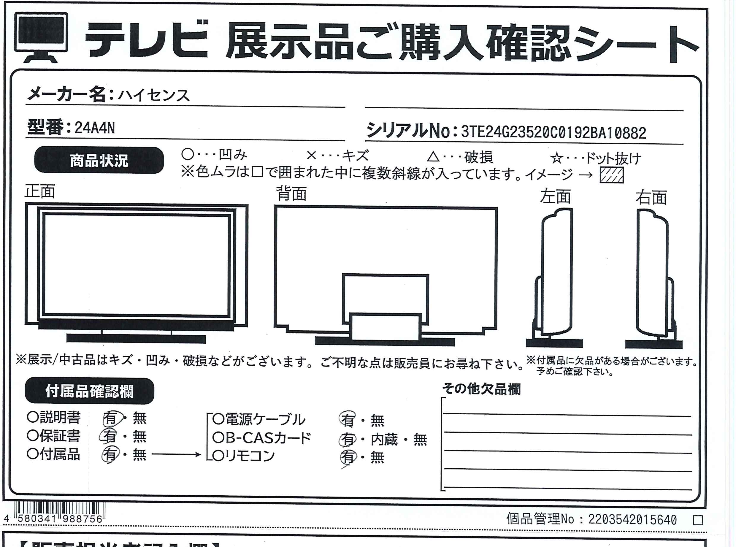 中古商品ランクについて 付属品・商品状態について 〔付属品〕説明書、電源コード、単三形乾電池X2、リモコン、転倒防止ベルト一式、スタンド一式、miniB-CASカード