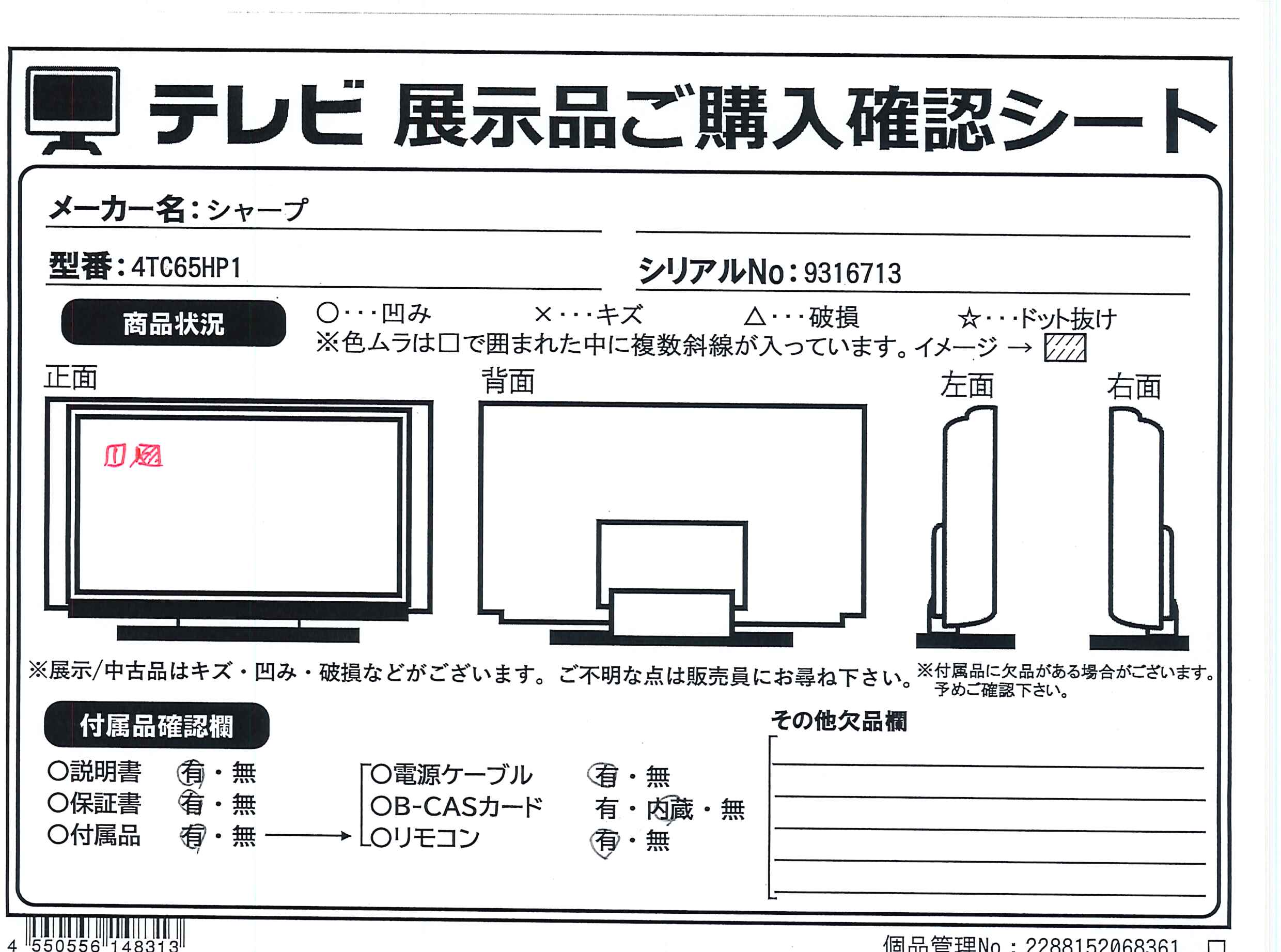 ![SHARP(シャープ) 液晶テレビ AQUOS 4T-C65HP1 [65V型 /Bluetooth対応 /4K対応 /BS・CS 4Kチューナー内蔵 /YouTube対応]](https://image.sofmap.com/images/product/large/4550556148313.jpg)
