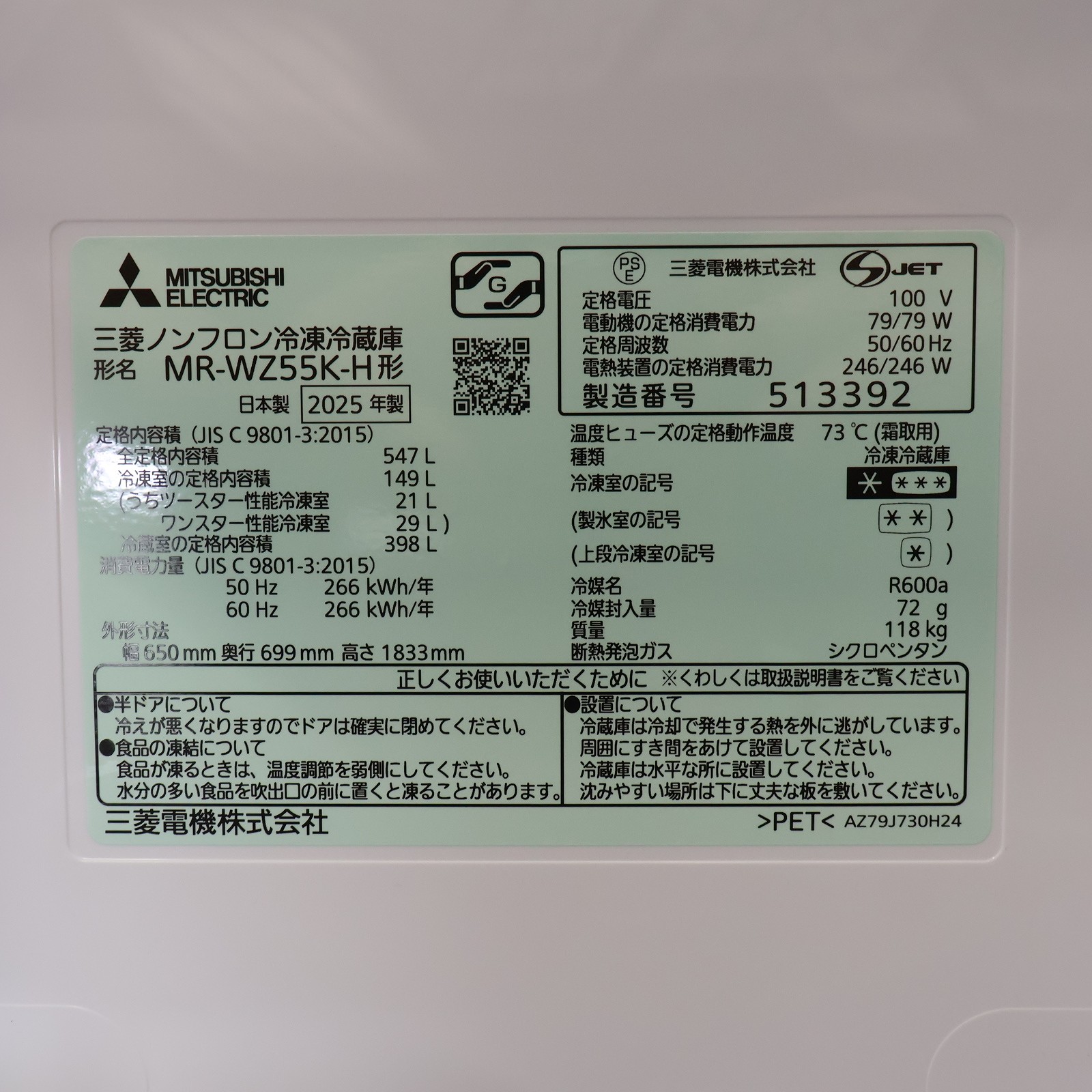 〔中古品〕 冷蔵庫 WZシリーズ グランドアンバーグレー MR-WZ55K-H [幅65cm /547L /6ドア /観音開きタイプ /2024年]