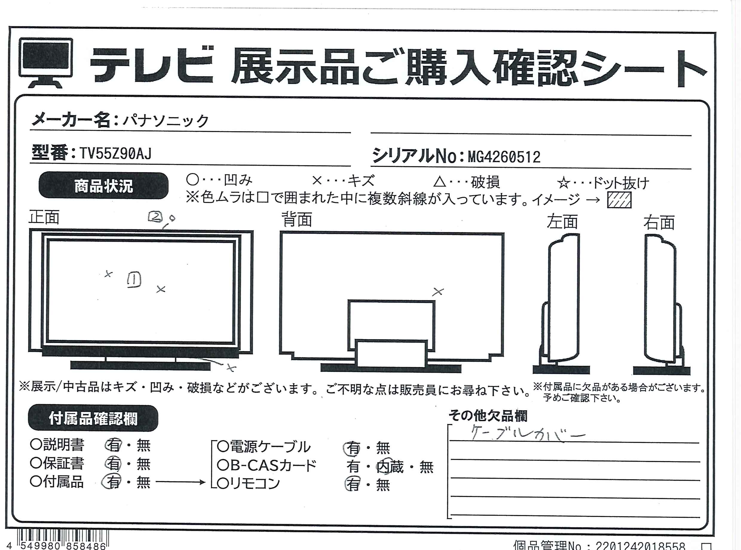 中古商品ランクについて 付属品・商品状態について 〔付属品〕取扱説明書、リモコン、リモコン用乾電池×2、転倒防止スタンド、本体固定用ねじ(M4)×4、転倒・落下防止部品一式