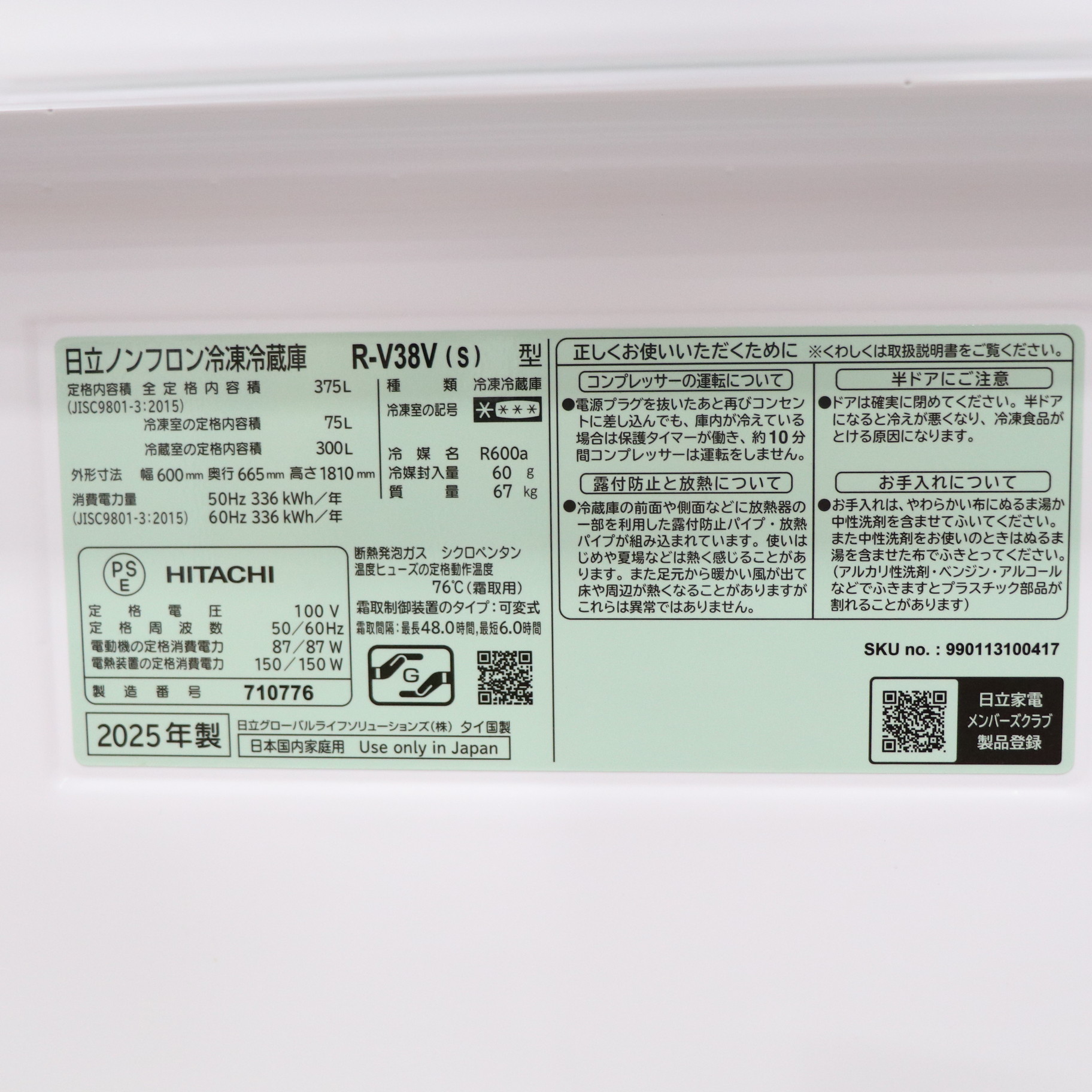 〔中古品〕 冷蔵庫 Vタイプ グラファイトシルバー R-V38V-S [幅60cm /375L /3ドア /右開きタイプ /2024年]