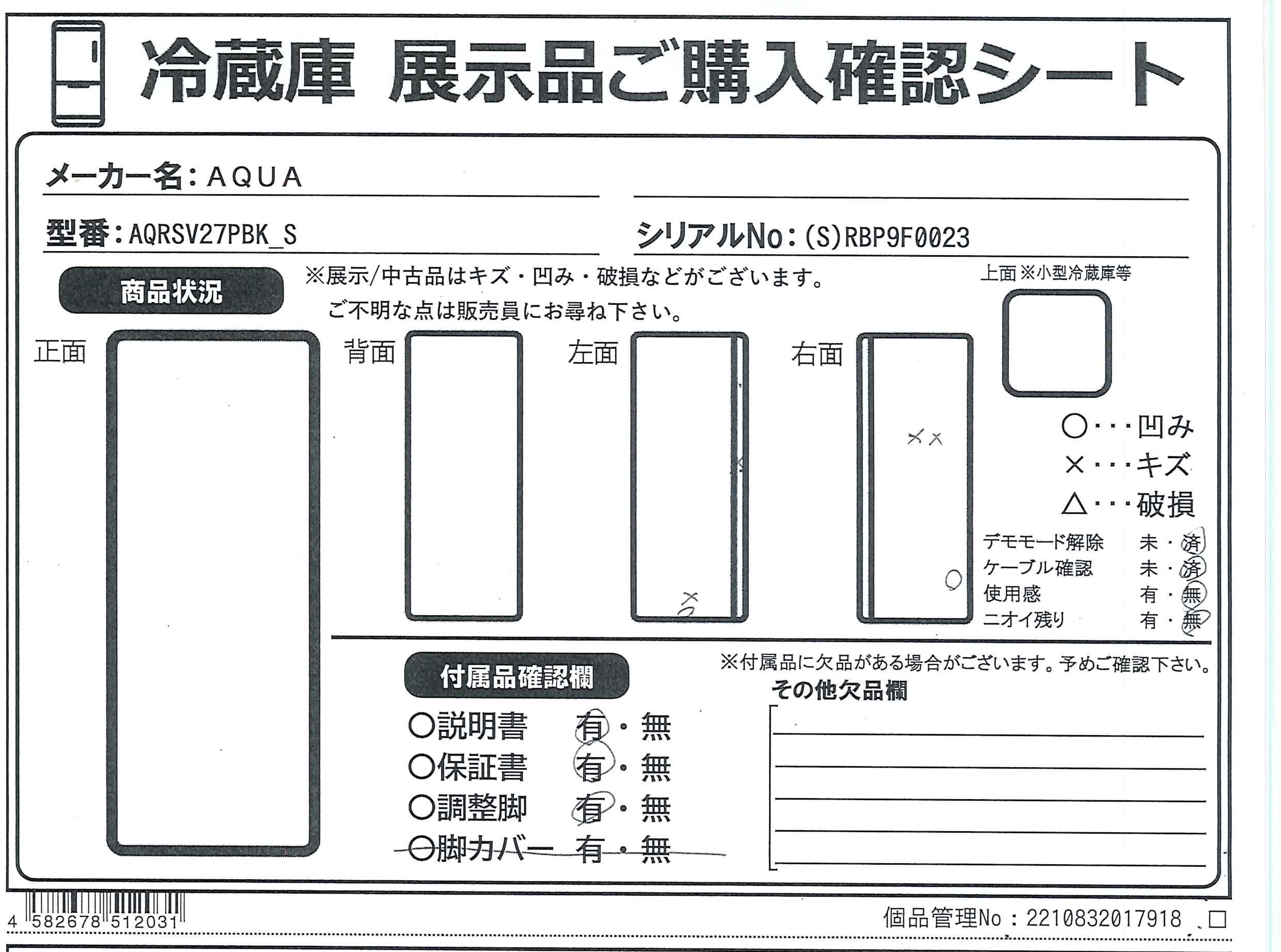 ▼同型番の新品商品はこちら![]() AQUA 冷蔵庫 ブライトシルバー AQR-SV27PBK(S) [幅60cm /272L /3ドア /右開きタイプ /2023年] 【基本設置料金セット】 ¥104,800(税込) 10,480ポイントサービス 在庫限り |